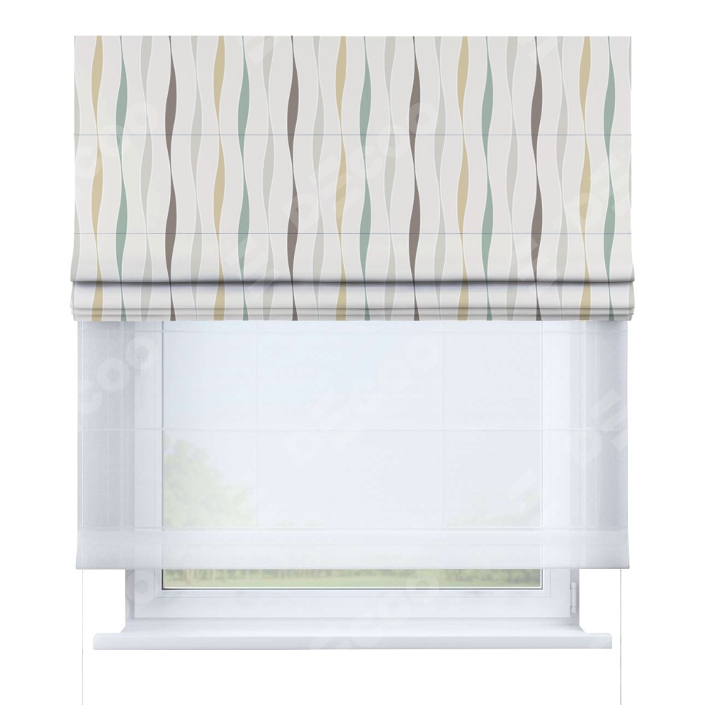 Римская штора день-ночь производителя «Cortin», используется для проёма, пошита из двух полотен, с лицевой блэкаут с нанесением сублимационной печати «Дельта», вторая ткань тюль (по стандарту комплектуется тюль белого цвета артикул V-01). Имеет универсальный механизм и подходит для монтажа: на потолок, на стену и в нишу.