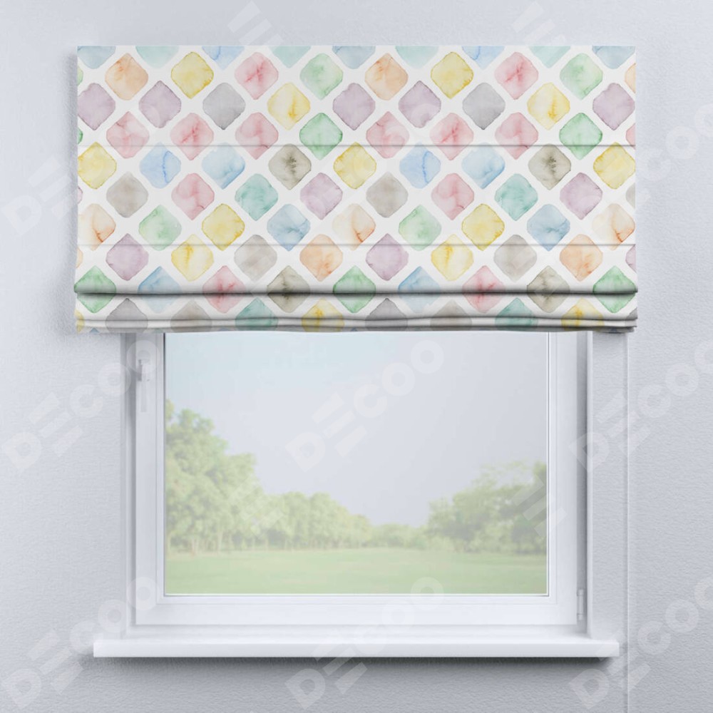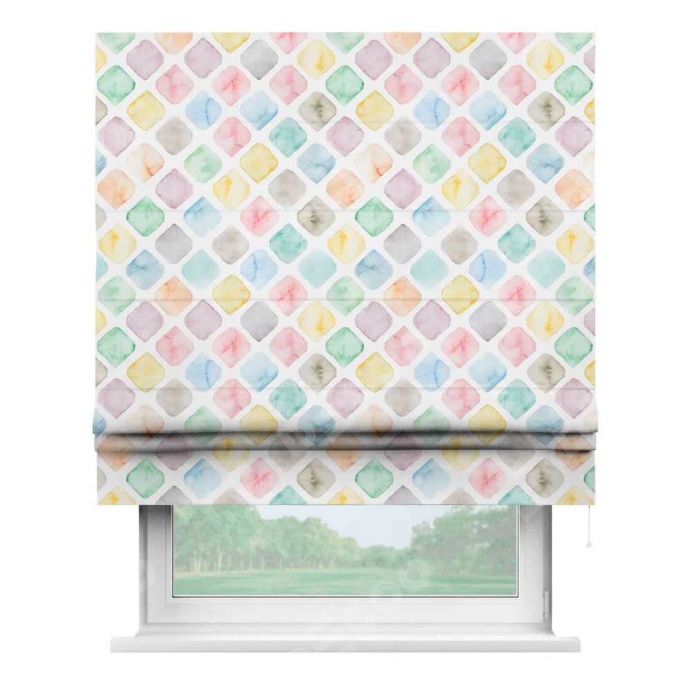 Римская штора производителя «Cortin», используется для проёма, пошита из ткани блэкаут с нанесением сублимационной печати «Мозаика акварель». Имеет универсальный механизм и подходит для монтажа: на потолок, на стену и в нишу.