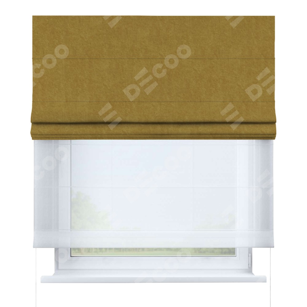 Римская штора день-ночь производителя «Cortin», используется для проёма, пошита из двух полотен, с лицевой стороны канвас горчица артикул v-476, вторая ткань тюль (по стандарту комплектуется тюль белого цвета артикул V-01). Имеет универсальный механизм и подходит для монтажа: на потолок, на стену и в нишу.