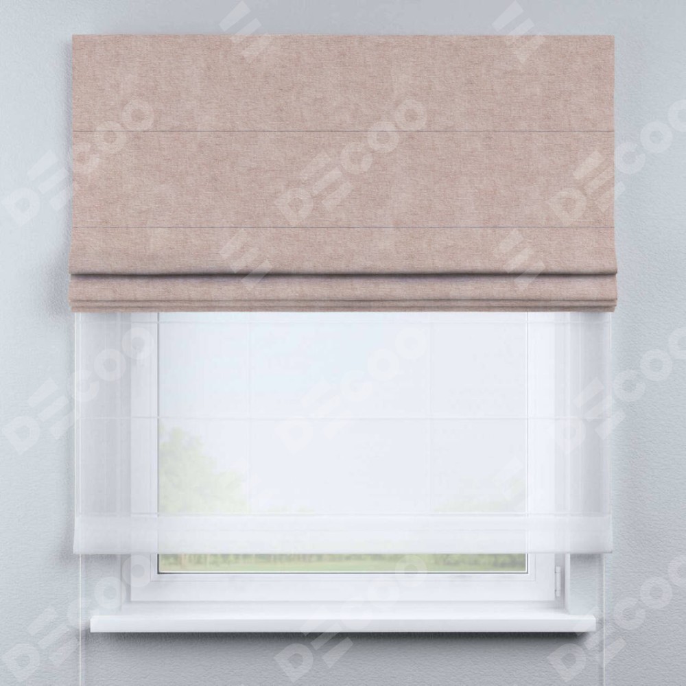 Римская штора день-ночь производителя «Cortin», используется для проёма, пошита из двух полотен, с лицевой стороны канвас пудровый артикул v-35, вторая ткань тюль (по стандарту комплектуется тюль белого цвета артикул V-01). Имеет универсальный механизм и подходит для монтажа: на потолок, на стену и в нишу.