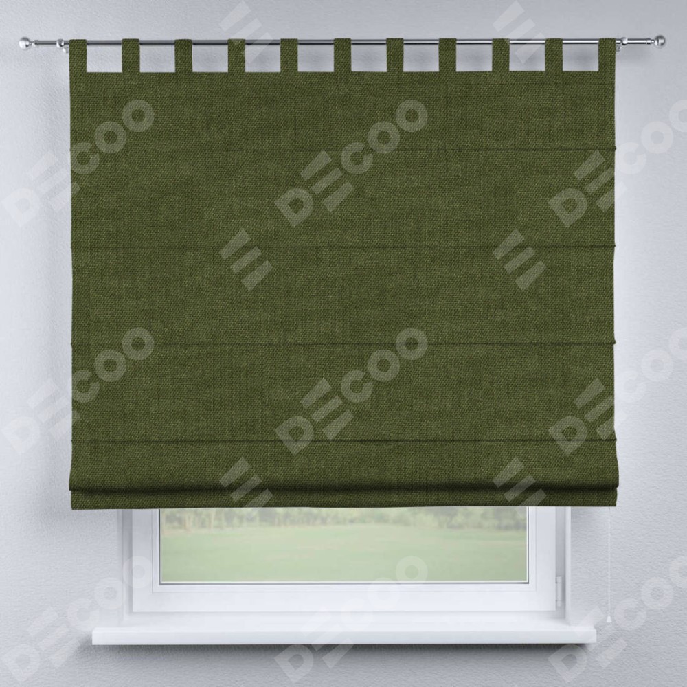 Римская штора производителя «Cortin», используется для проёма, пошита из ткани лён димаут салатовый, артикул ткани 91002. Данная модель пошита на петлях, комплектуется на выбор круглым карнизом и подходит для монтажа на стену. Римская штора на петлях имеет простую систему регулировки высоты, отличительным преимуществом данной модели является простой способ монтажа. Достаточно повесить ее на трубу и штора готова!