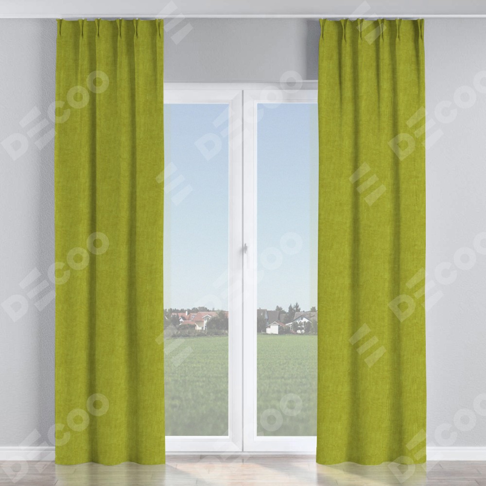 Комплект прямых штор, от производителя «Cortin», пошиты из ткани канвас зелёное яблоко, артикул ткани v-370. С изнаночной стороны в верхней части штор пристрачивается шторная лента с декоративными складками «Кустик». Для создания элегантных складок прямые шторы шьются по стандарту с коэффициентом 1:2 (на 100 см. ширины проёма 200 см. ширины ткани).