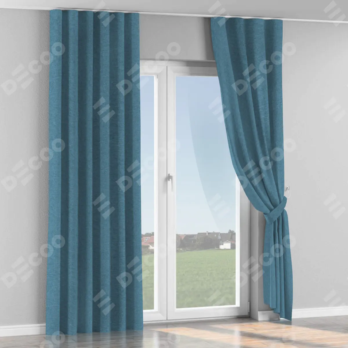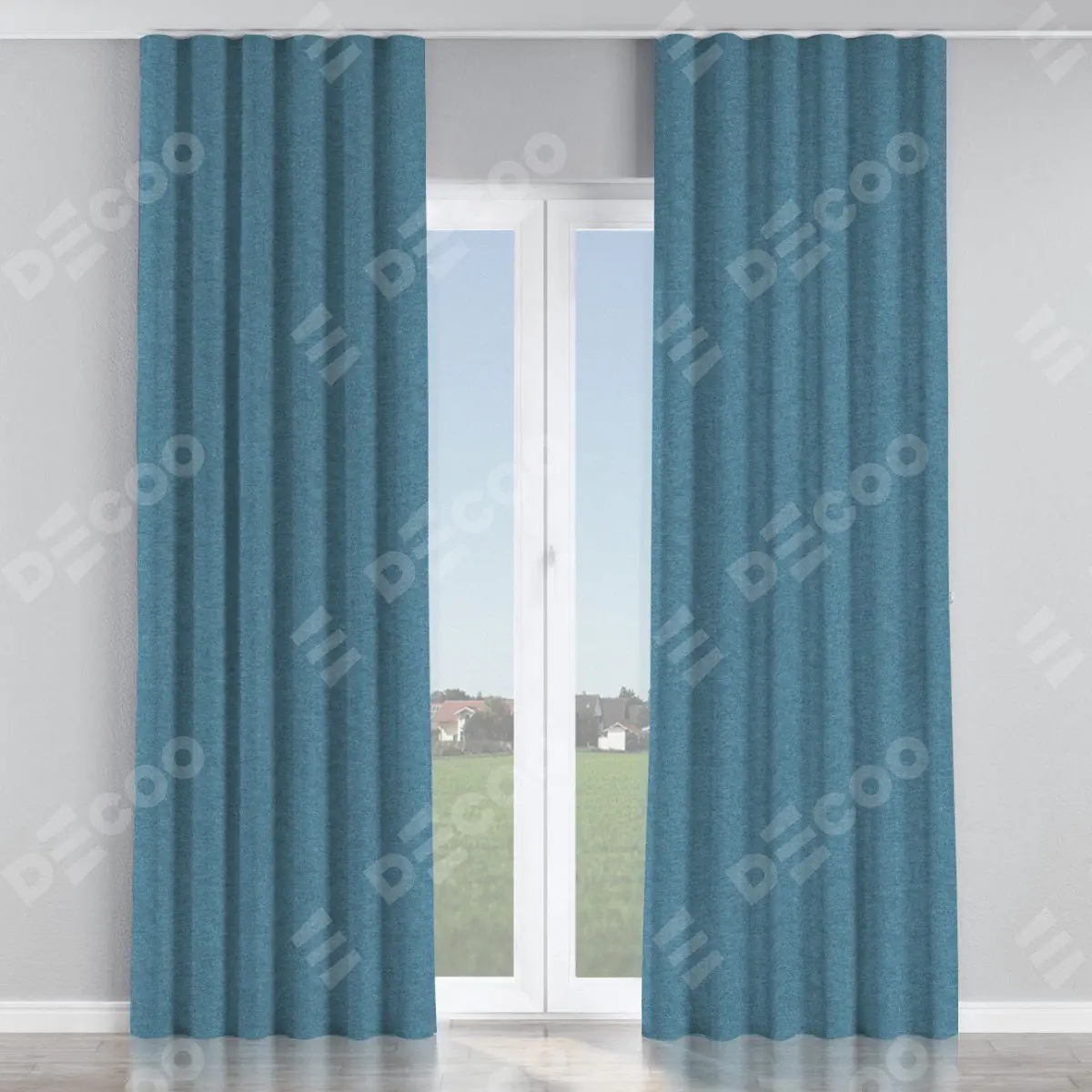 Комплект прямых штор, от производителя «Cortin», пошиты из ткани твид блэкаут светло-синий, артикул ткани 90935. С изнаночной стороны в верхней части штор пристрачивается шторная лента с декоративными складками «Волна». Для создания элегантных складок прямые шторы шьются по стандарту с коэффициентом 1:2 (на 100 см. ширины проёма 200 см. ширины ткани).