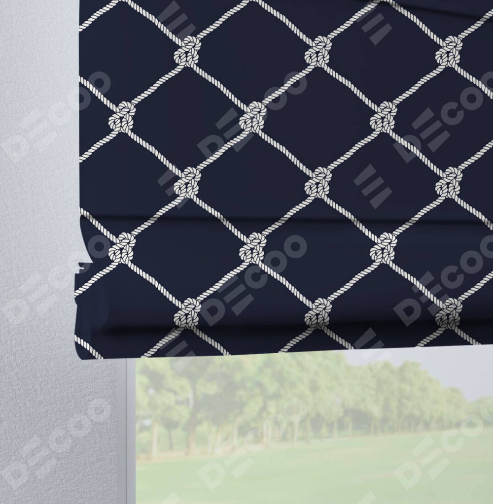Римская штора производителя «Cortin», используется для проёма, пошита из ткани блэкаут с нанесением сублимационной печати «Морские веревки». Данная модель пошита на петлях, комплектуется на выбор круглым карнизом и подходит для монтажа на стену. Римская штора на петлях имеет простую систему регулировки высоты, отличительным преимуществом данной модели является простой способ монтажа. Достаточно повесить ее на трубу и штора готова!
