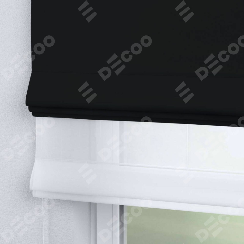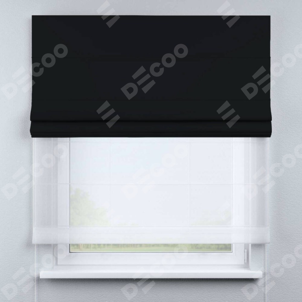 Двойная римская штора «День-ночь» от производителя Cortin предназначена для использования в проёмах. Эта штора уникальна тем, что состоит из двух полотен. На лицевой стороне находится однотонный черный блэкаут (артикул: 91571−2), обеспечивающий эффективное затемнение. В комплект также входит вторая ткань — легкий белый тюль (артикул: V-01), который добавляет изящества и легкости оформлению окна. Кроме того, доступны и другие разновидности ткани тюль, выбор которых доступен по ссылке .