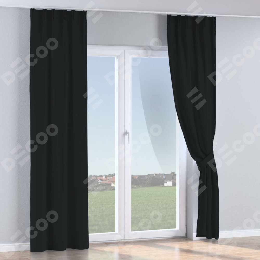 Комплект прямых штор, от производителя «Cortin», пошиты из ткани блэкаут однотонный черный, артикул ткани 91571−2. С изнаночной стороны в верхней части штор пристрачивается шторная лента с декоративными складками «Кустик». Для создания элегантных складок прямые шторы шьются по стандарту с коэффициентом 1:2 (на 100 см. ширины проёма 200 см. ширины ткани).
