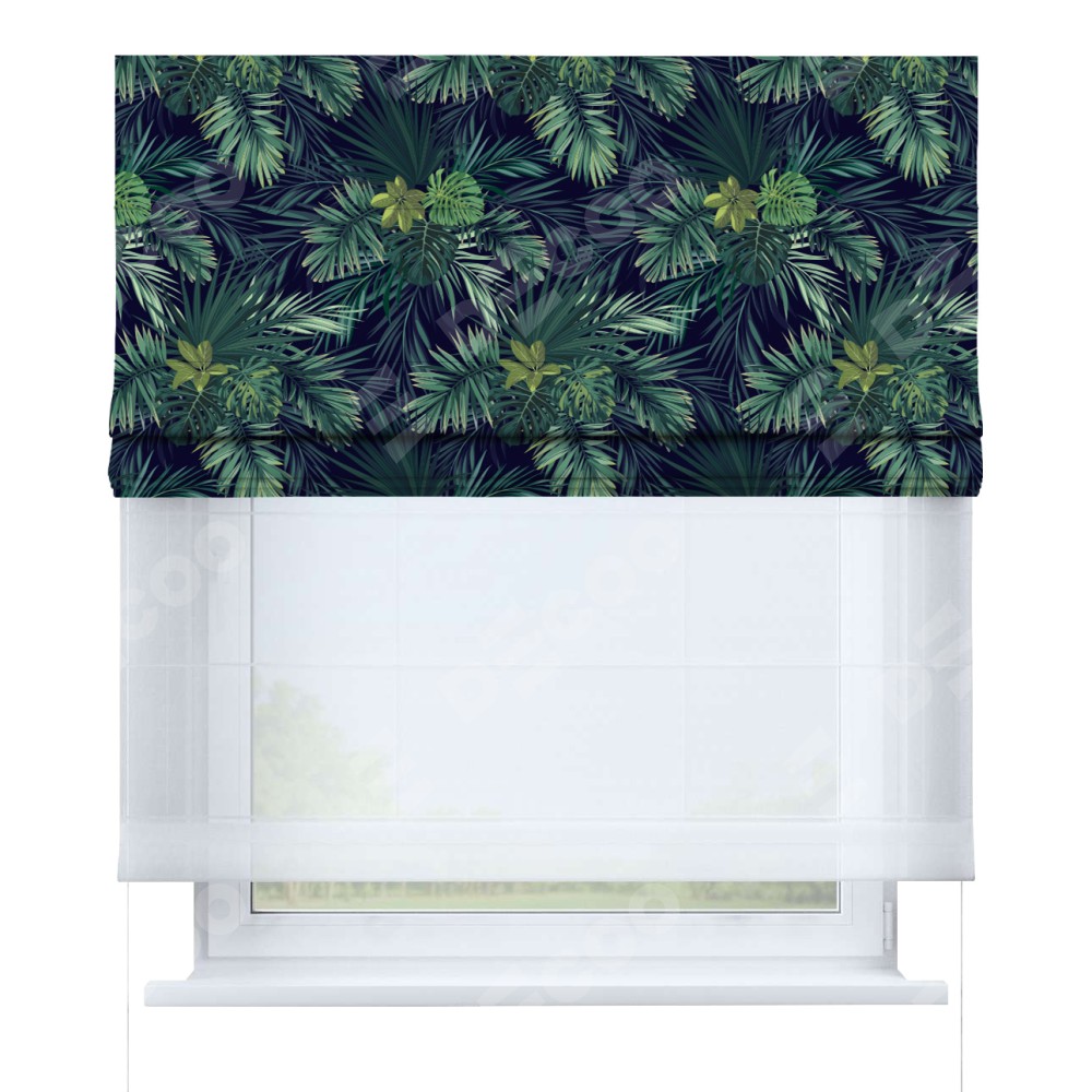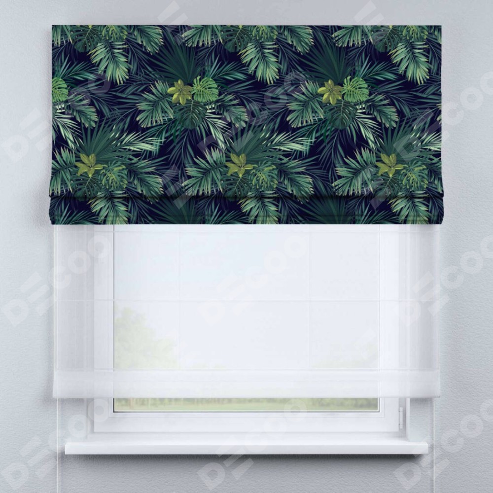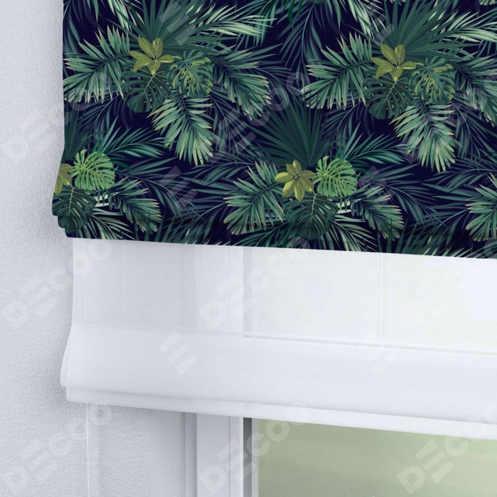 Римская штора день-ночь производителя «Cortin», используется для проёма, пошита из двух полотен, с лицевой блэкаут с нанесением сублимационной печати «Пальмовые листья», вторая ткань тюль (по стандарту комплектуется тюль белого цвета артикул V-01). Имеет универсальный механизм и подходит для монтажа: на потолок, на стену и в нишу.
