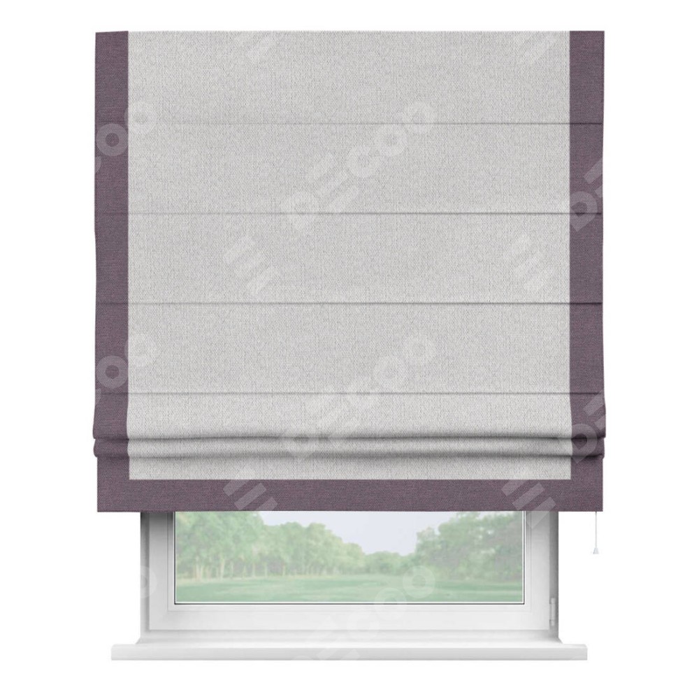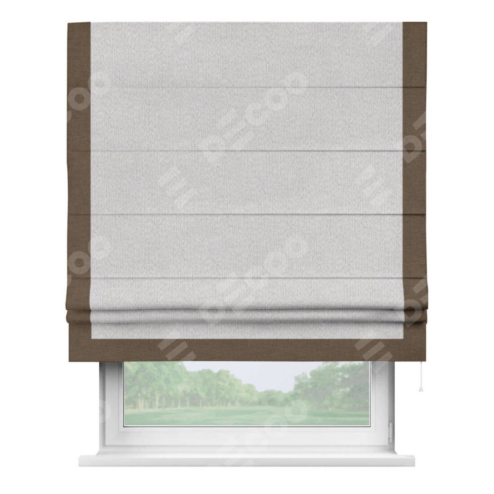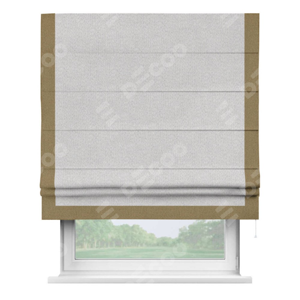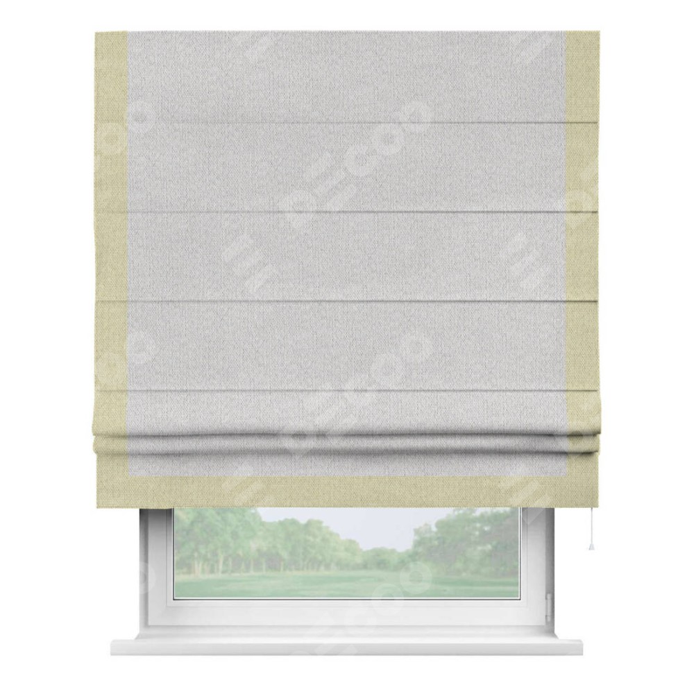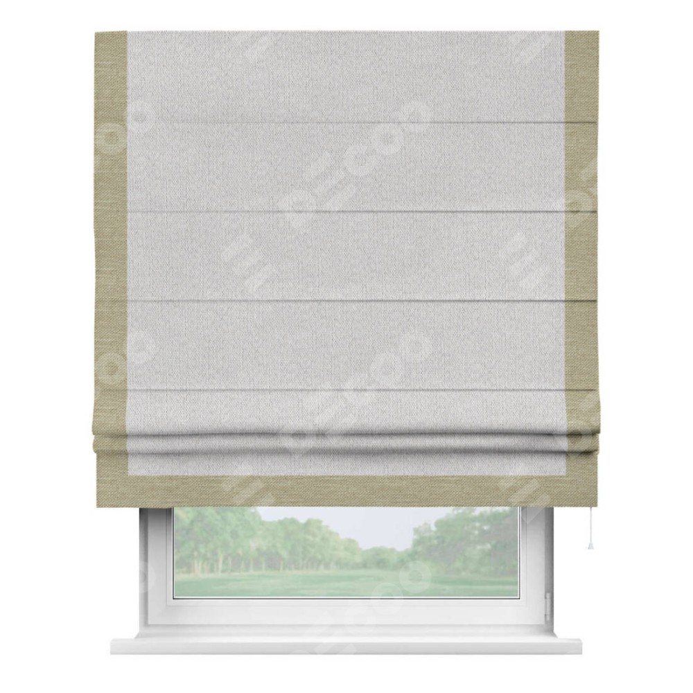Римская штора производителя «Cortin», используется для проёма, пошита из ткани лён димаут светло-бежевый, артикул 90993. Отделка шторы кантом «Виктория», ткань для канта используется из льна димаут разной расцветки на выбор. Имеет универсальный механизм и подходит для монтажа: на потолок, на стену и в нишу.