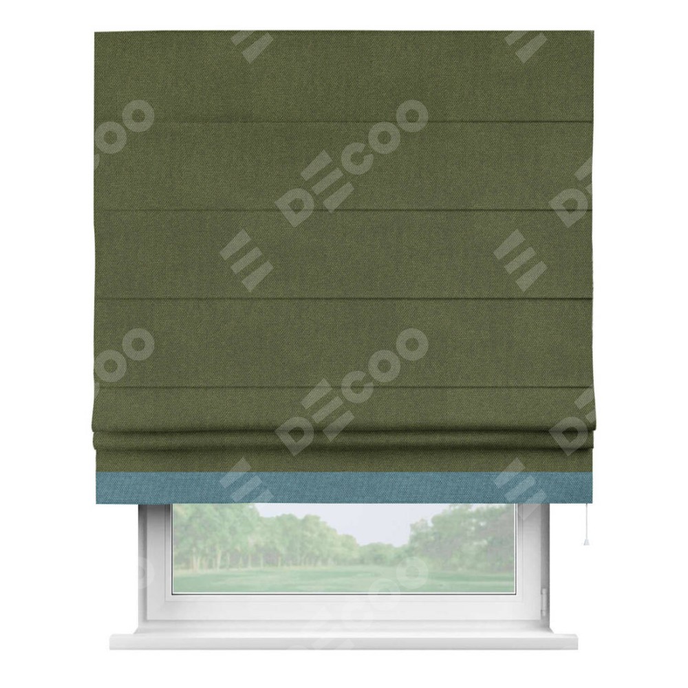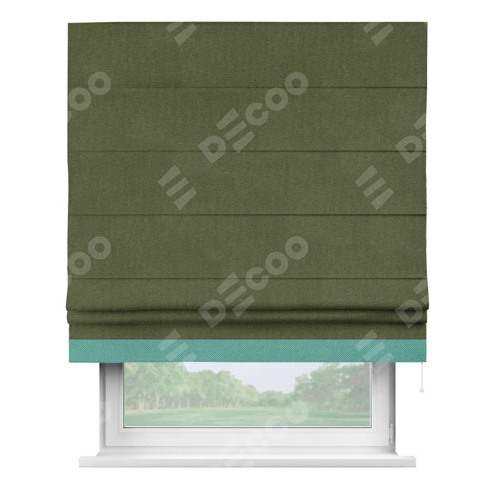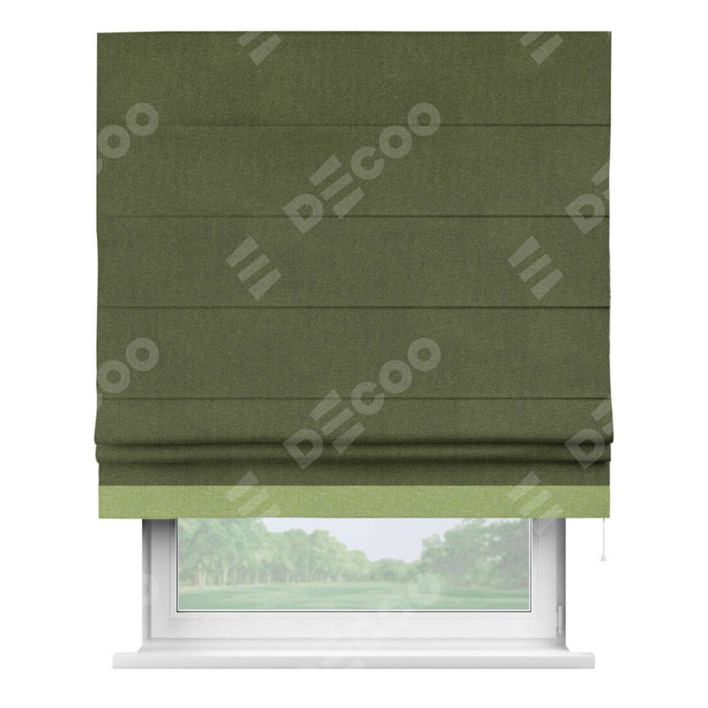 Римская штора производителя «Cortin», используется для проёма, пошита из ткани лён димаут салатовый, артикул 91002. Отделка шторы кантом «Джестер», ткань для канта используется из льна димаут разной расцветки на выбор. Имеет универсальный механизм и подходит для монтажа: на потолок, на стену и в нишу.