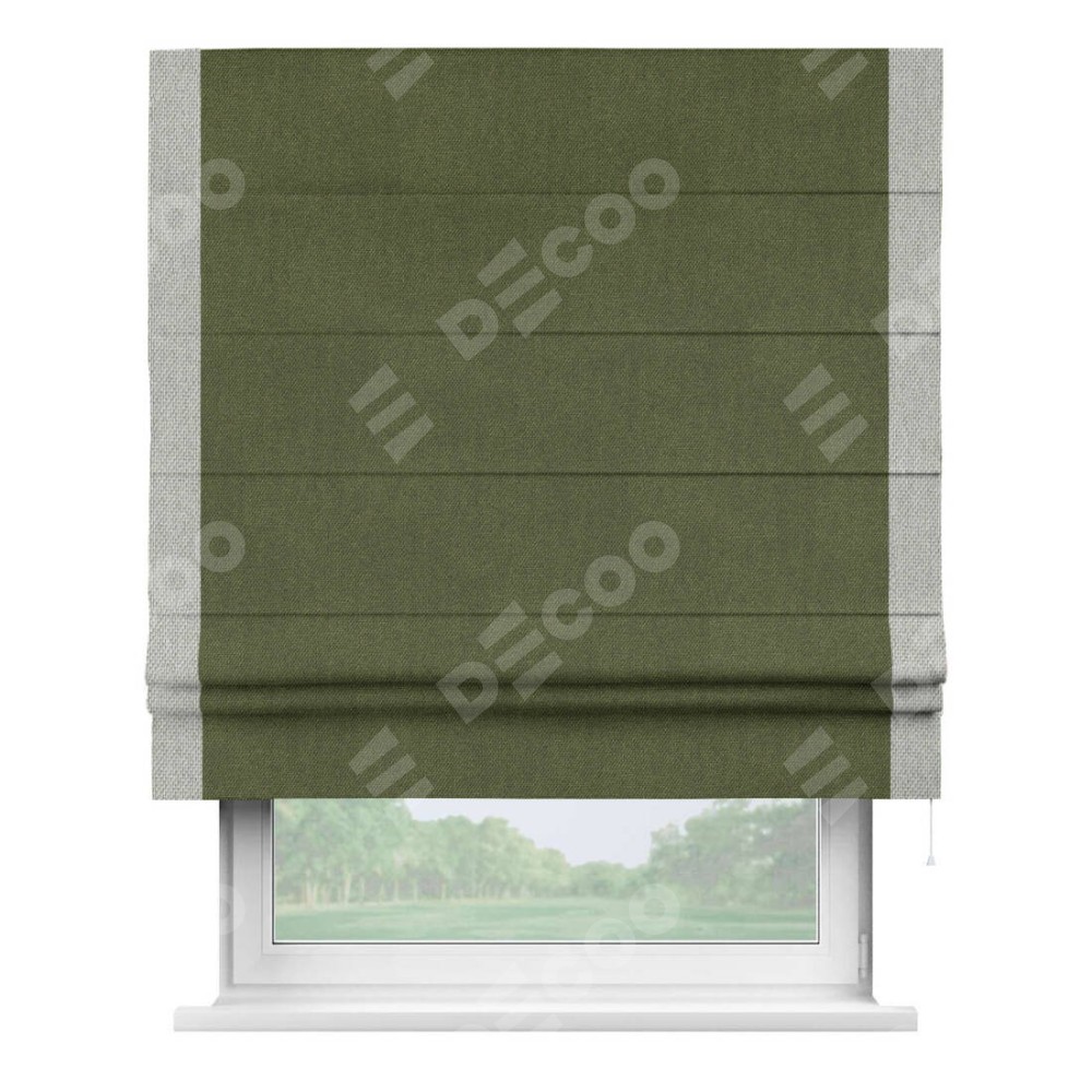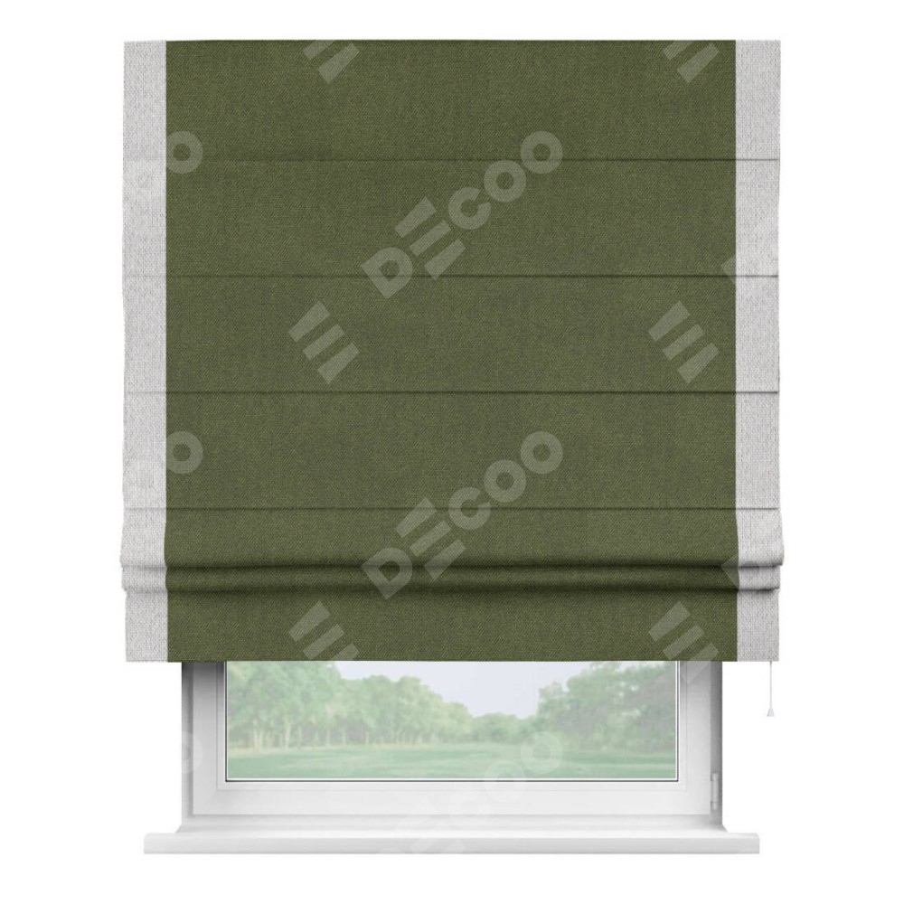 Римская штора производителя «Cortin», используется для проёма, пошита из ткани лён димаут салатовый, артикул 91002. Отделка шторы кантом «Стрим Дуо», ткань для канта используется из льна димаут разной расцветки на выбор. Имеет универсальный механизм и подходит для монтажа: на потолок, на стену и в нишу.