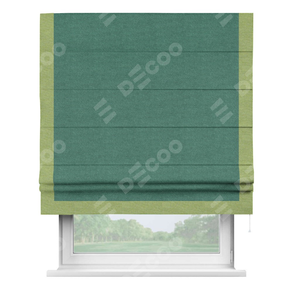 Римская штора производителя «Cortin», используется для проёма, пошита из ткани лён димаут светло-бирюзовый, артикул 91005. Отделка шторы кантом «Виктория», ткань для канта используется из льна димаут разной расцветки на выбор. Имеет универсальный механизм и подходит для монтажа: на потолок, на стену и в нишу.