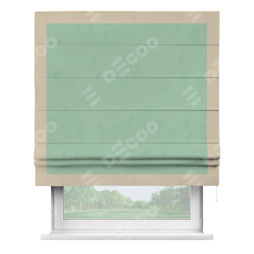 Римская штора производителя «Cortin», используется для проёма, пошита из ткани блэкаут однотонный ментоловый, артикул ткани 91572−1. Отделка шторы кантом «Чесс», ткань для канта используется из блэкаута однотонного разной расцветки на выбор. Имеет универсальный механизм и подходит для монтажа: на потолок, на стену и в нишу.