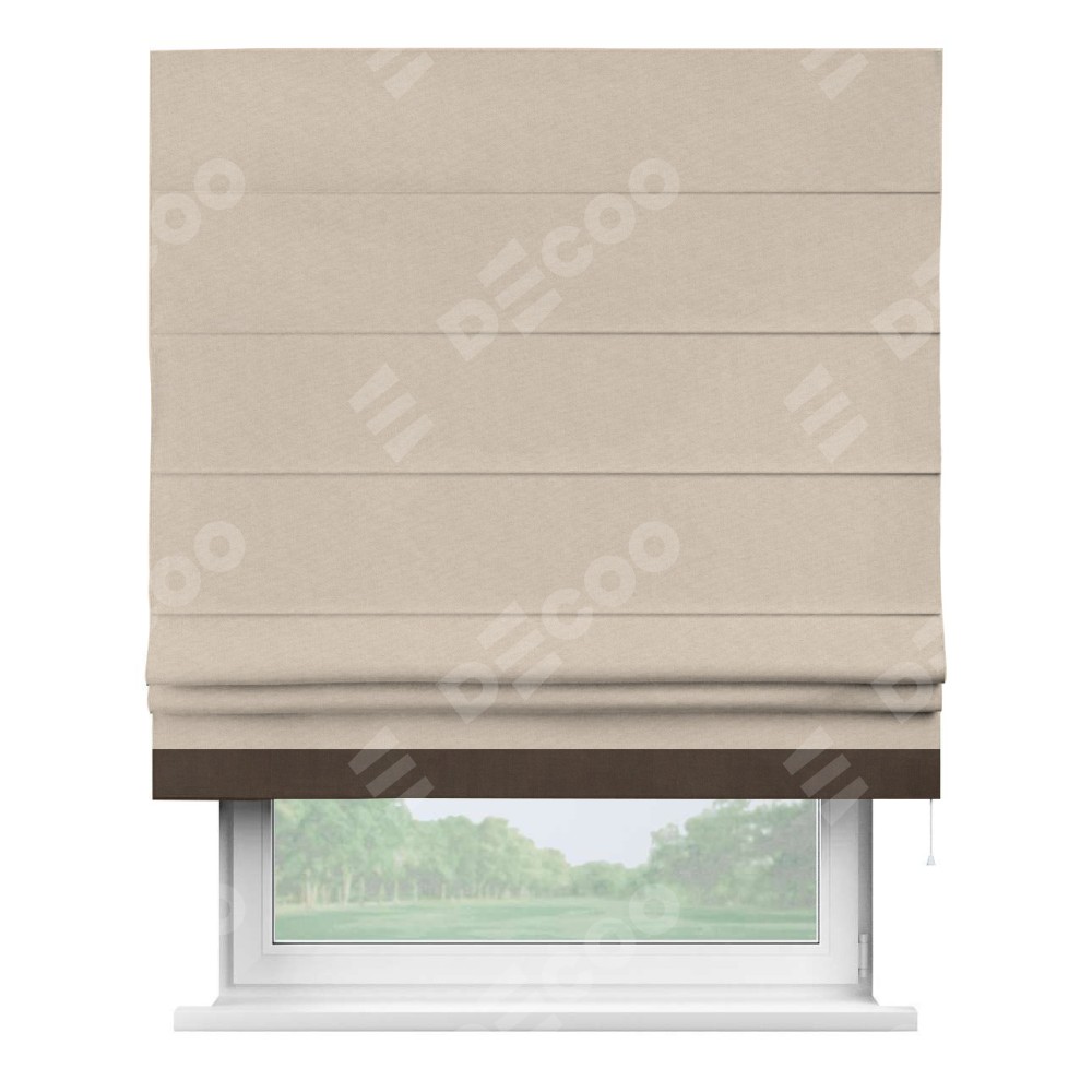 Римская штора производителя «Cortin», используется для проёма, пошита из ткани канвас кофе с молоком, артикул ткани v-07. Отделка шторы кантом «Джестер» (махагон v-37), ткань для канта используется из канваса разной расцветки на выбор. Имеет универсальный механизм и подходит для монтажа: на потолок, на стену и в нишу.