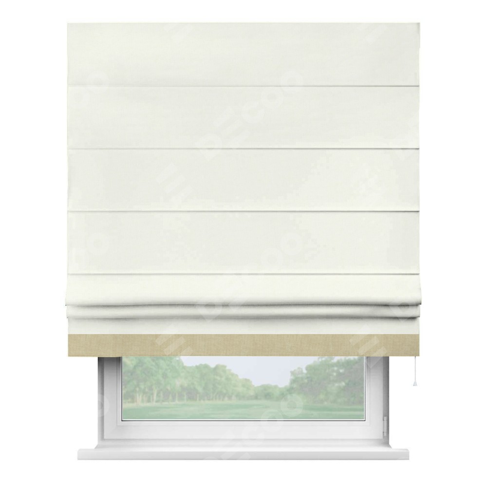 Римская штора производителя «Cortin», используется для проёма, пошита из ткани канвас молочный, артикул ткани v-93. Отделка шторы кантом «Джестер» (тёмно-бежевый v-196), ткань для канта используется из канваса разной расцветки на выбор. Имеет универсальный механизм и подходит для монтажа: на потолок, на стену и в нишу.