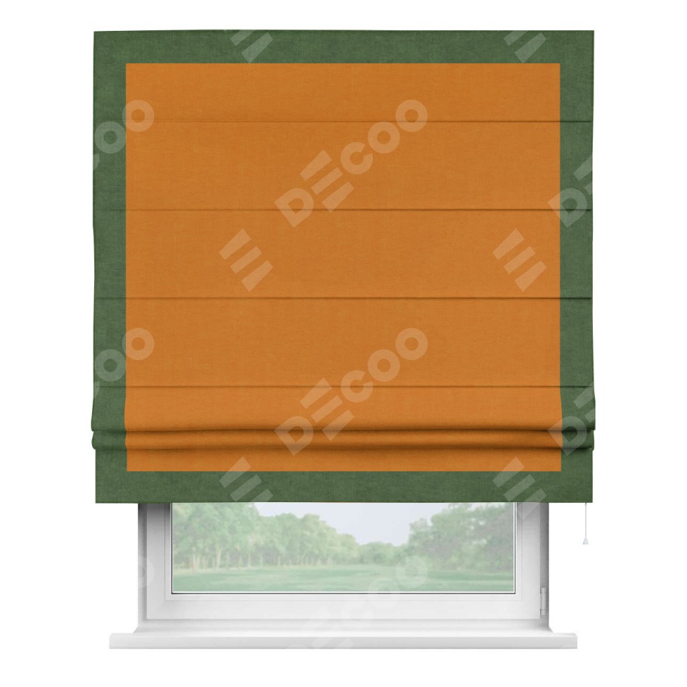 Римская штора производителя «Cortin», используется для проёма, пошита из ткани канвас оранжевый, артикул ткани v-106. Отделка шторы кантом «Чесс» (зелёный v-16), ткань для канта используется из канваса разной расцветки на выбор. Имеет универсальный механизм и подходит для монтажа: на потолок, на стену и в нишу.