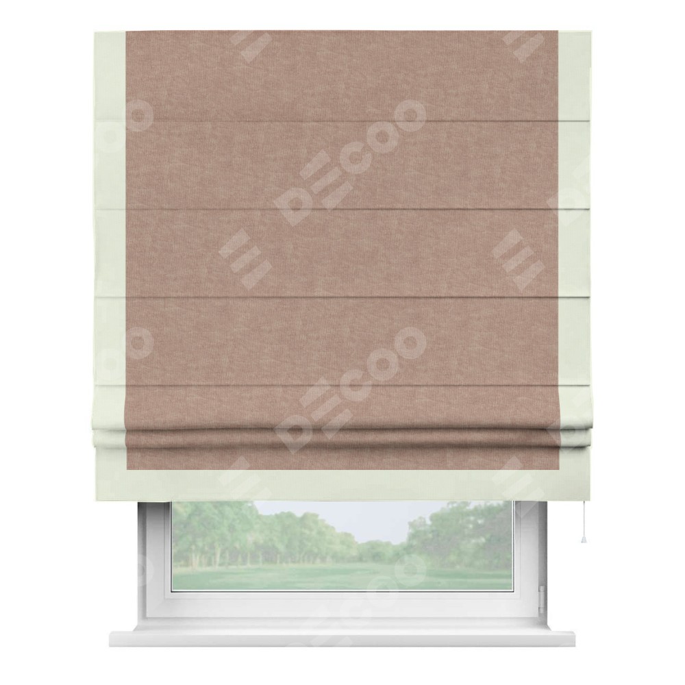 Римская штора производителя «Cortin», используется для проёма, пошита из ткани канвас розовая пудра, артикул ткани v-34. Отделка шторы кантом «Виктория» (сливочный v-94), ткань для канта используется из канваса разной расцветки на выбор. Имеет универсальный механизм и подходит для монтажа: на потолок, на стену и в нишу.