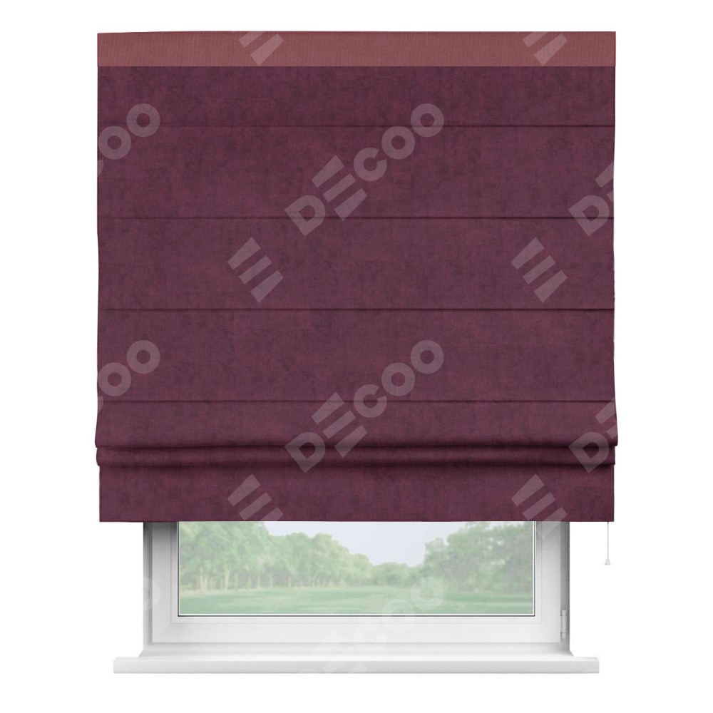 Римская штора производителя «Cortin», используется для проёма, пошита из ткани канвас фиолетовый, артикул ткани v-99. Отделка шторы кантом «Кинг» (ягодный v-28), ткань для канта используется из канваса разной расцветки на выбор. Имеет универсальный механизм и подходит для монтажа: на потолок, на стену и в нишу.