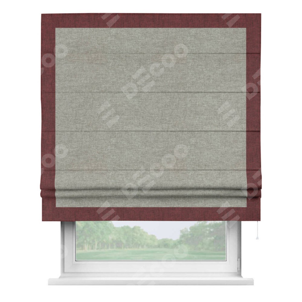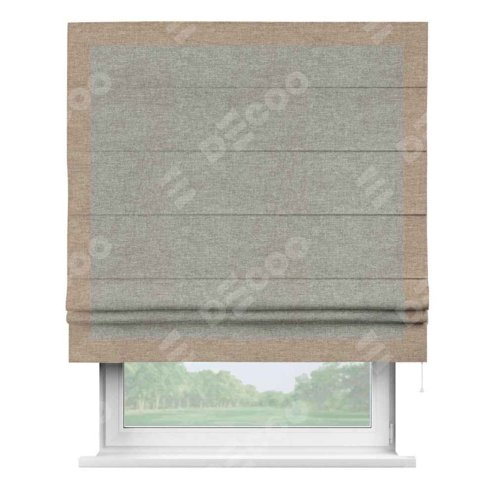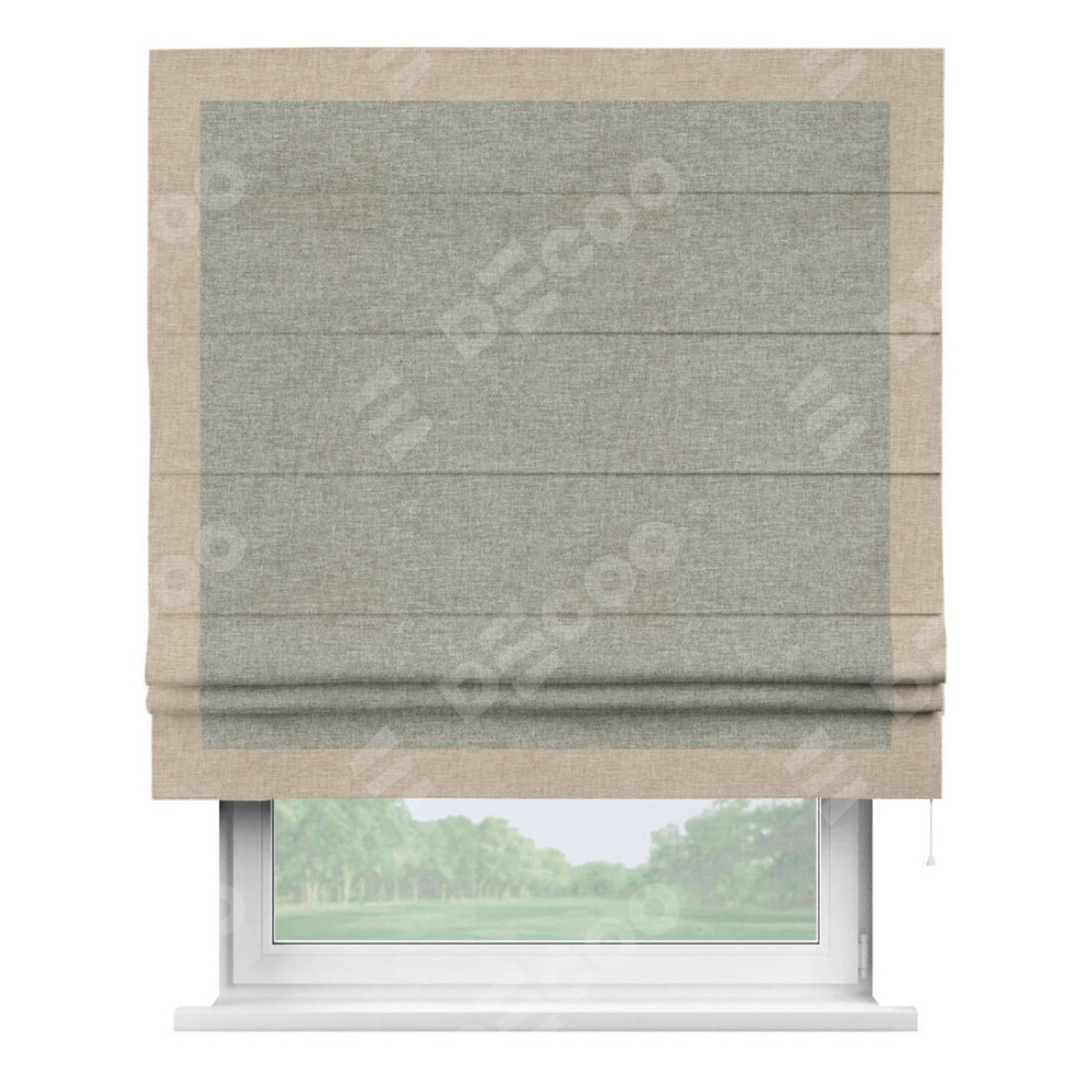 Римская штора производителя «Cortin», используется для проёма, пошита из ткани лён кашемир серый, артикул 17208. Отделка шторы кантом «Чесс», ткань для канта используется из льна разной расцветки на выбор. Имеет универсальный механизм и подходит для монтажа: на потолок, на стену и в нишу.