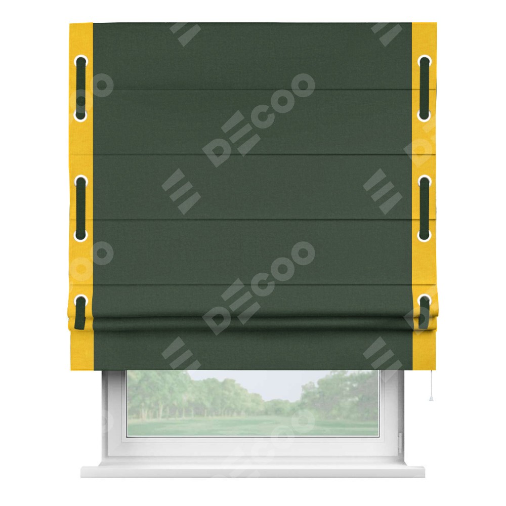 Римская штора производителя «Cortin», используется для проёма, пошита из ткани канвас глубокий зелёный, артикул ткани v-588. Отделка шторы кантом «Стрим Дуо» (желтый v-344) на кантах расположены люверсы с пояском, ткань для канта используется из канваса разной расцветки на выбор. Ткань для пояска обычно используется из основной ткани шторы, а так же можно сделать из любой расцветки по желанию. Имеет универсальный механизм и подходит для монтажа: на потолок, на стену и в нишу.