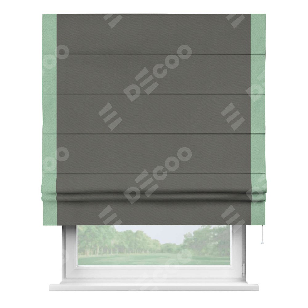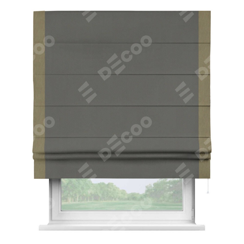 Римская штора производителя «Cortin», используется для проёма, пошита из ткани блэкаут однотонный тёмно-серый, артикул ткани 91570. Отделка шторы кантом «Стрим Дуо», ткань для канта используется из блэкаута однотонного разной расцветки на выбор. Имеет универсальный механизм и подходит для монтажа: на потолок, на стену и в нишу.