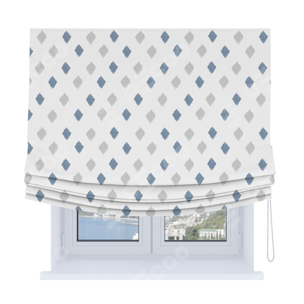 Римская штора Soft производителя «Cortin», используется для проёма, пошита из ткани блэкаут с нанесением сублимационной печати «Икат ромбики». Имеет универсальный механизм и подходит для монтажа: на потолок, на стену и в нишу. В отличие от стандартных римских штор, римская штора Soft не имеет горизонтальных вставок и нижнего отвеса. Это позволяет ткани произвольно драпироваться в свободные мягкие складки.