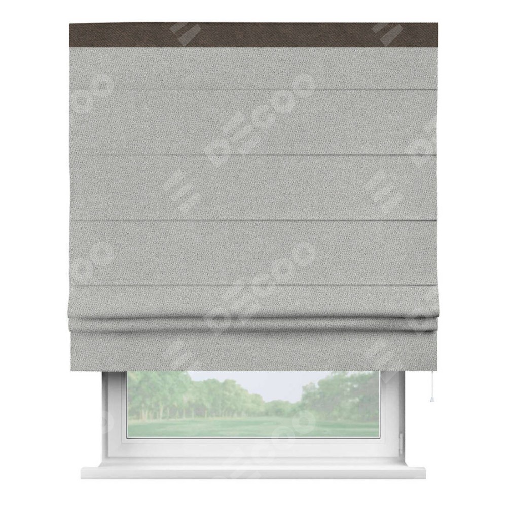 Римская штора производителя «Cortin», используется для проёма, пошита из ткани твид блэкаут светло-серый, артикул 90936. Отделка шторы кантом «Кинг», ткань для канта используется из твида разной расцветки на выбор. Имеет универсальный механизм и подходит для монтажа: на потолок, на стену и в нишу.
