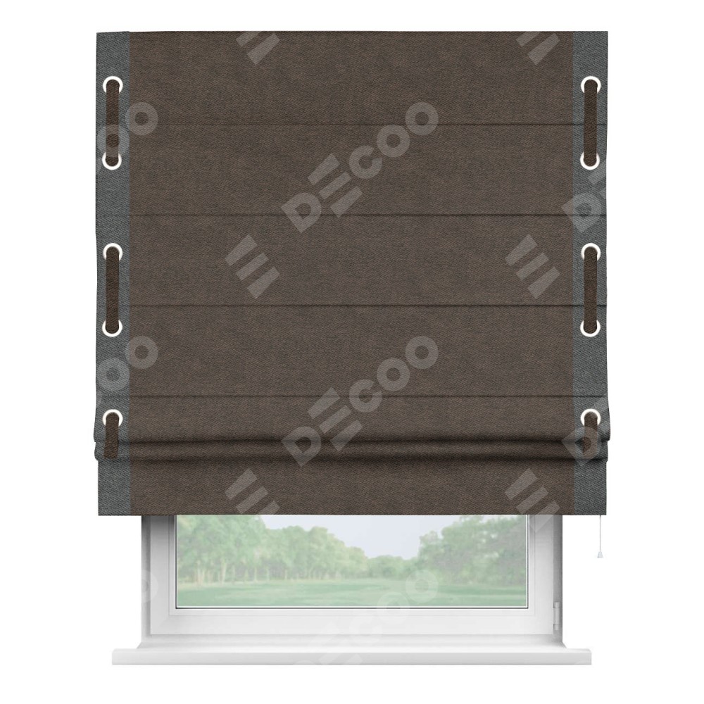 Римская штора производителя «Cortin», используется для проёма, пошита из ткани твид блэкаут тёмно-коричневый, артикул 90933. Отделка шторы кантом «Стрим Дуо» на кантах расположены люверсы с пояском, ткань для канта используется из твида разной расцветки на выбор. Ткань для пояска обычно используется из основной ткани шторы, а так же можно сделать из любой расцветки по желанию. Имеет универсальный механизм и подходит для монтажа: на потолок, на стену и в нишу.
