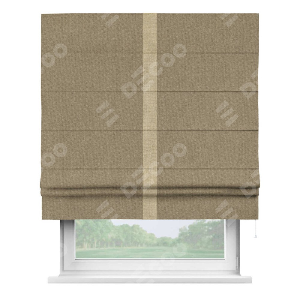 Римская штора пошита из ткани лён димаут тёмно-бежевый, артикул: 16261, с отделкой кантом «Хайвэй» представляет собой уникальное и смелое дизайнерское решение, где кант расположен вертикально посередине шторы. Этот дизайн не только выделяет штору среди других вариантов оформления окон, но и создает интересный визуальный акцент, привлекая внимание к центру окна и разделяя штору на визуальные зоны. Такой нестандартный подход добавляет динамичности интерьеру и может быть использован для подчеркивания особенностей оформления помещения.