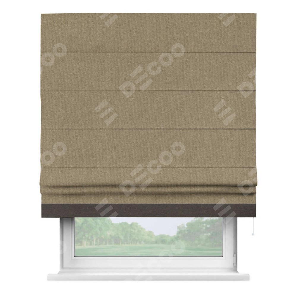 Римская штора пошита из ткани лён димаут тёмно-бежевый, артикул: 16261, с отделкой кантом «Джестер» выделяется своей уникальной особенностью — кантом, расположенным только снизу шторы. Этот дизайн добавляет оригинальности и игривости оконному оформлению, делая акцент на нижней части шторы и создавая интересный визуальный эффект. Отделка кантом на нижнем крае не только служит эстетической функции, но и способствует увеличению прочности и износостойкости ткани в этом месте.
