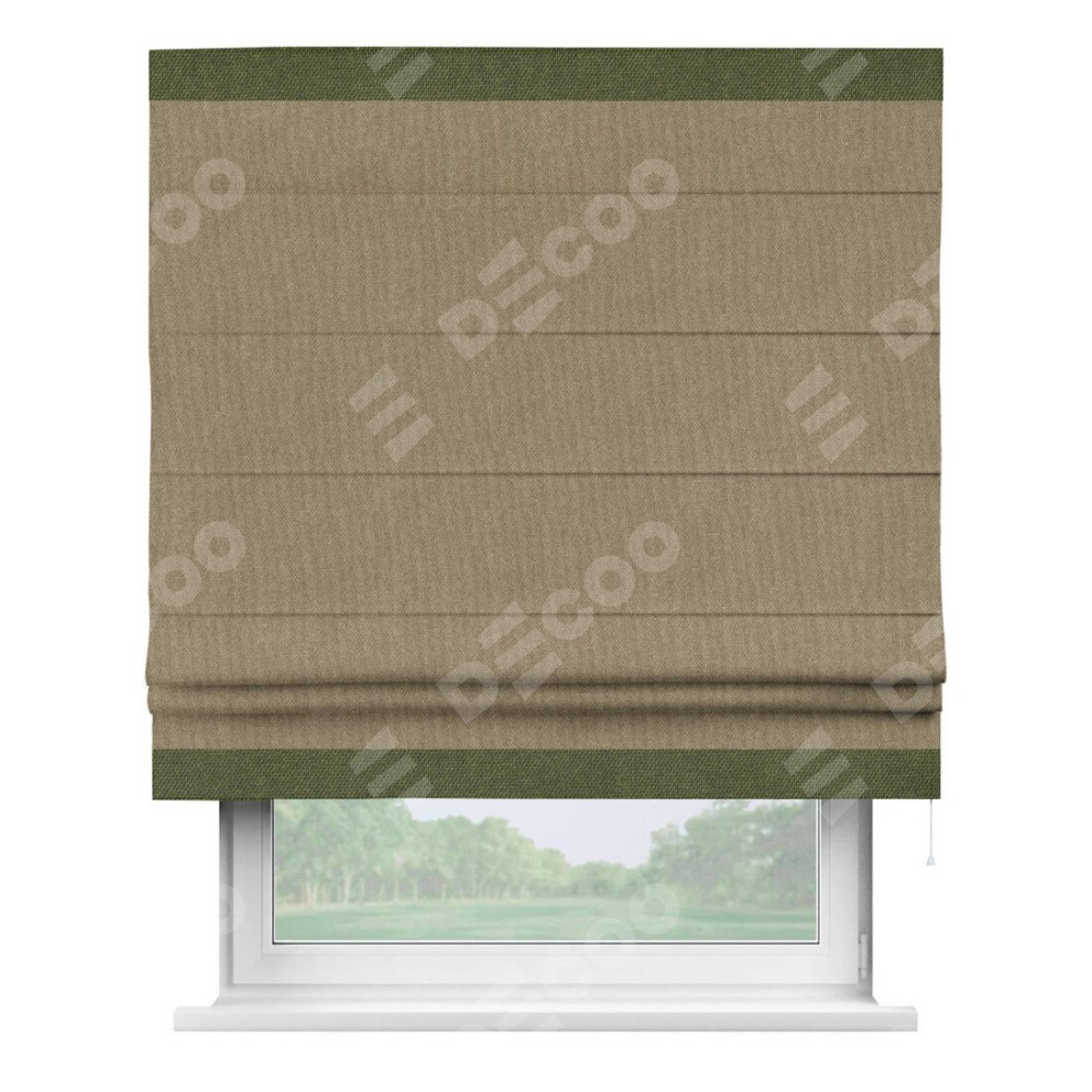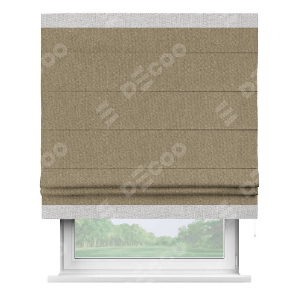 Римская штора пошита из ткани лён димаут тёмно-бежевый, артикул: 16261, с отделкой кантом «Горизонт» предлагает уникальное дизайнерское решение, при котором кант располагается только вверху и снизу шторы. Такое решение делает акцент на горизонтальных линиях, визуально расширяя пространство и придавая окну более строгий и организованный вид. Отделка кантом в этих ключевых местах не только украшает штору, но и способствует её долговечности, защищая наиболее уязвимые к износу края.