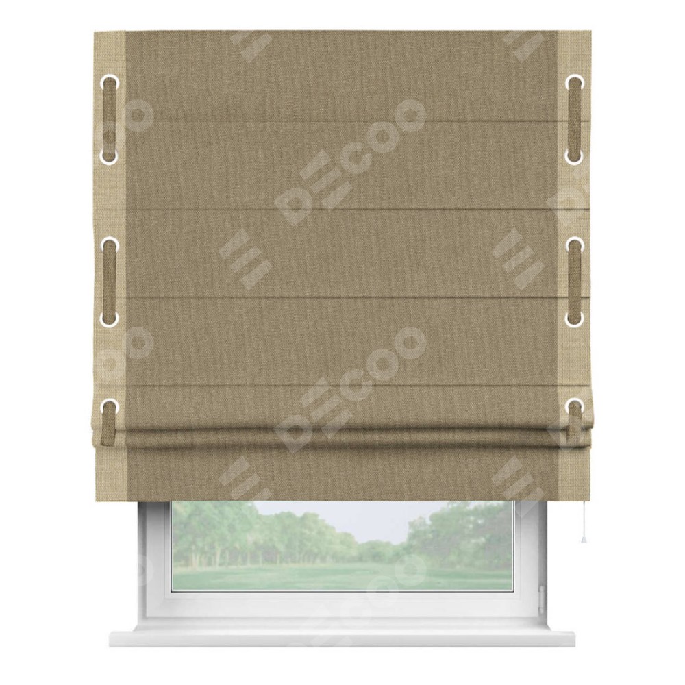 Римская штора пошита из ткани лён димаут тёмно-бежевый, артикул: 16261, с отделкой кантом «Стрим Дуо», дополненная декоративными люверсами на этих кантах и протянутым пояском из основного цвета римской шторы, представляет собой высоко декоративное и функциональное решение для оконного оформления. Канты, расположенные по обеим боковым сторонам шторы, уже добавляют изысканности и завершенности внешнему виду. Добавление люверсов и пояска не только усиливает декоративный эффект, но и придает шторе дополнительную текстурность и глубину.