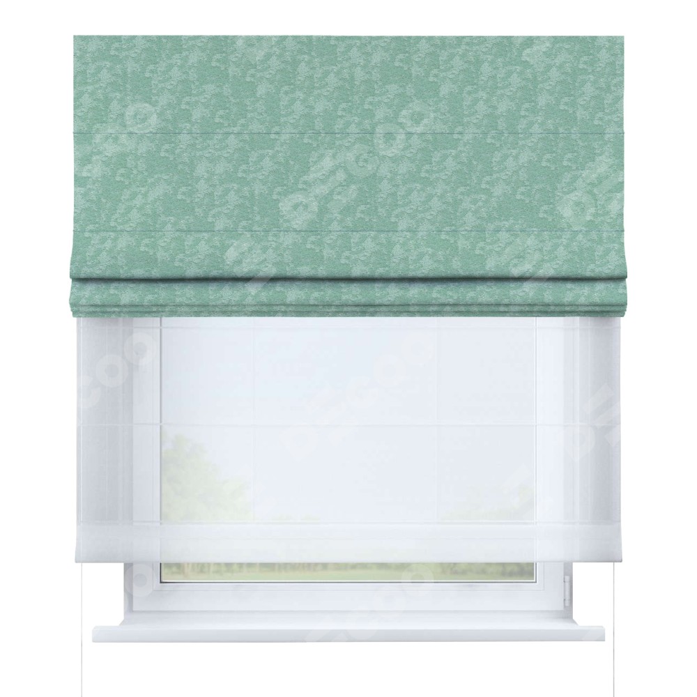 Двойная римская штора «День-ночь» от производителя Cortin предназначена для использования в проёмах. Эта штора уникальна тем, что состоит из двух полотен. На лицевой стороне находится софт мрамор светло-зелёный (артикул: 93579), обеспечивающий эффективное затемнение. В комплект также входит вторая ткань — легкий белый тюль (артикул: V-01), который добавляет изящества и легкости оформлению окна. Кроме того, доступны и другие разновидности ткани тюль, выбор которых доступен по  ссылке .
