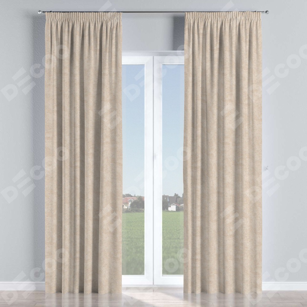 Комплект прямых штор, от производителя «Cortin», пошиты из ткани софт мрамор шампань, артикул ткани 93575. С изнаночной стороны в верхней части штор пристрачивается шторная лента с декоративными складками «Карандаш». Для создания элегантных складок прямые шторы шьются по стандарту с коэффициентом 1:2 (на 100 см. ширины проёма 200 см. ширины ткани).