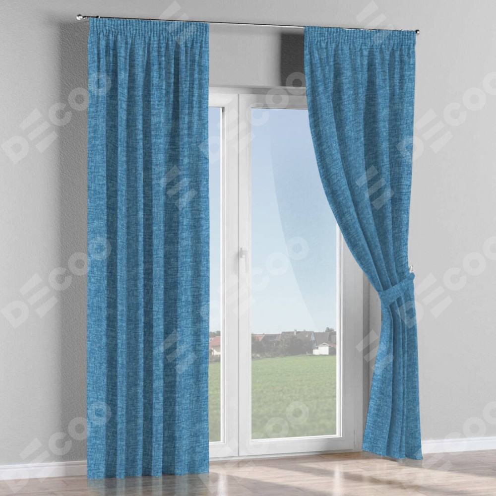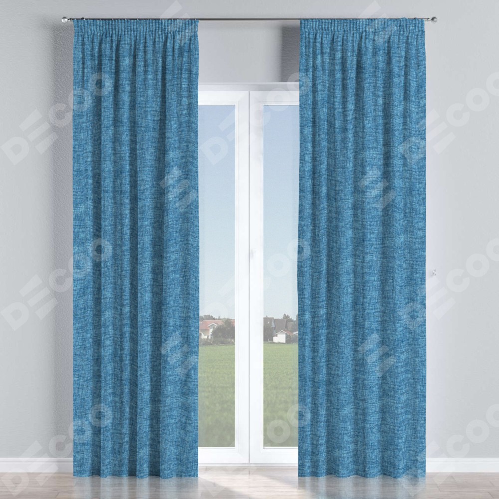 Комплект прямых штор, от производителя «Cortin», пошиты из ткани рогожка димаут джинс, артикул ткани 91026. С изнаночной стороны в верхней части штор пристрачивается шторная лента с декоративными складками «Карандаш». Для создания элегантных складок прямые шторы шьются по стандарту с коэффициентом 1:2 (на 100 см. ширины проёма 200 см. ширины ткани).