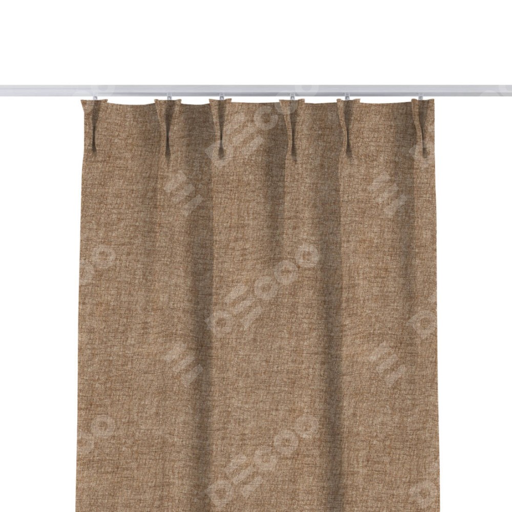 Комплект прямых штор, от производителя «Cortin», пошиты из ткани рогожка димаут светло-коричневый, артикул ткани 91017. С изнаночной стороны в верхней части штор пристрачивается шторная лента с декоративными складками «Кустик». Для создания элегантных складок прямые шторы шьются по стандарту с коэффициентом 1:2 (на 100 см. ширины проёма 200 см. ширины ткани).