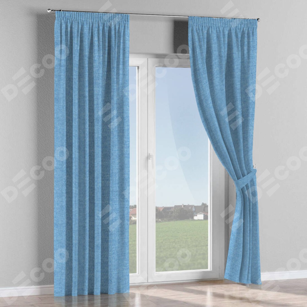 Комплект прямых штор, от производителя «Cortin», пошиты из ткани рогожка димаут голубой, артикул ткани 91025. С изнаночной стороны в верхней части штор пристрачивается шторная лента с декоративными складками «Карандаш». Для создания элегантных складок прямые шторы шьются по стандарту с коэффициентом 1:2 (на 100 см. ширины проёма 200 см. ширины ткани).