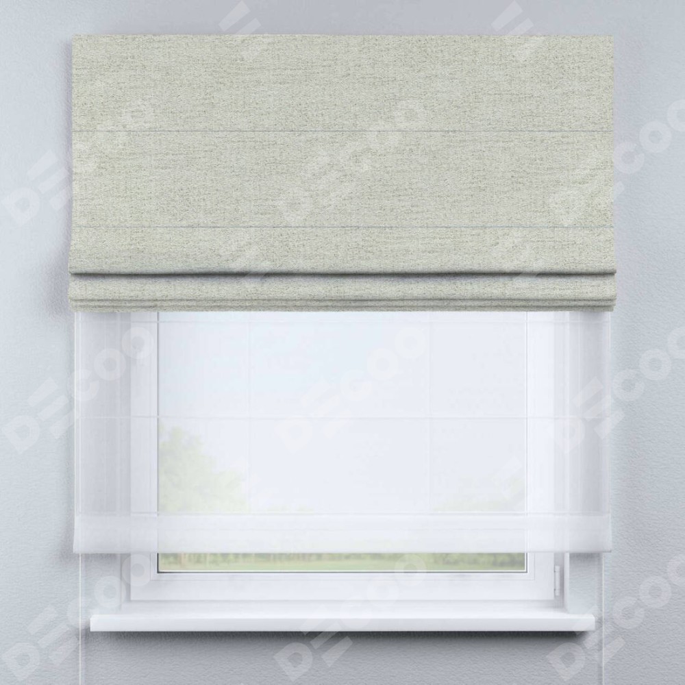 Двойная римская штора «День-ночь» от производителя Cortin предназначена для использования в проёмах. Эта штора уникальна тем, что состоит из двух полотен. На лицевой стороне находится рогожка димаут серо-бежевый (артикул: 91014), обеспечивающий эффективное затемнение. В комплект также входит вторая ткань — легкий белый тюль (артикул: V-01), который добавляет изящества и легкости оформлению окна. Кроме того, доступны и другие разновидности ткани тюль, выбор которых доступен по ссылке .