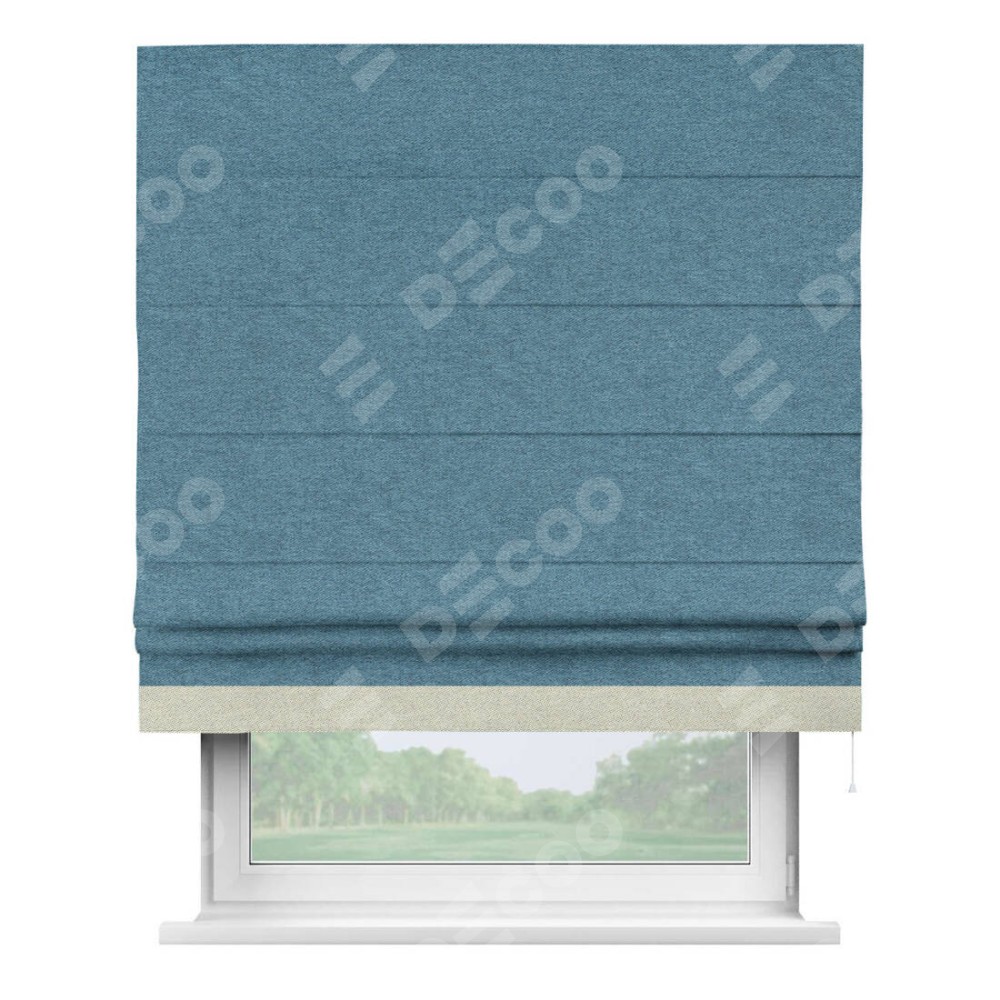 Римская штора пошита из ткани твид блэкаут светло-синий, артикул: 90935, с отделкой кантом «Джестер» выделяется своей уникальной особенностью — кантом, расположенным только снизу шторы. Этот дизайн добавляет оригинальности и игривости оконному оформлению, делая акцент на нижней части шторы и создавая интересный визуальный эффект. Отделка кантом на нижнем крае не только служит эстетической функции, но и способствует увеличению прочности и износостойкости ткани в этом месте.