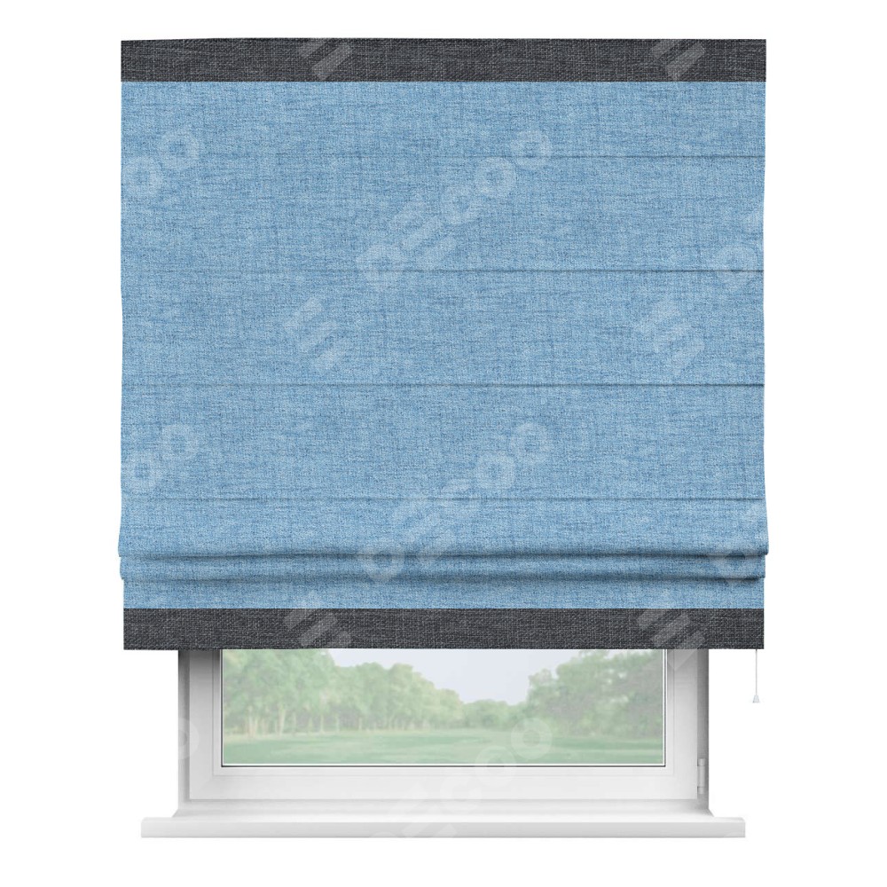 Римская штора пошита из ткани рогожка димаут голубой, артикул: 91025, с отделкой кантом «Горизонт» предлагает уникальное дизайнерское решение, при котором кант располагается только вверху и снизу шторы. Такое решение делает акцент на горизонтальных линиях, визуально расширяя пространство и придавая окну более строгий и организованный вид. Отделка кантом в этих ключевых местах не только украшает штору, но и способствует её долговечности, защищая наиболее уязвимые к износу края.