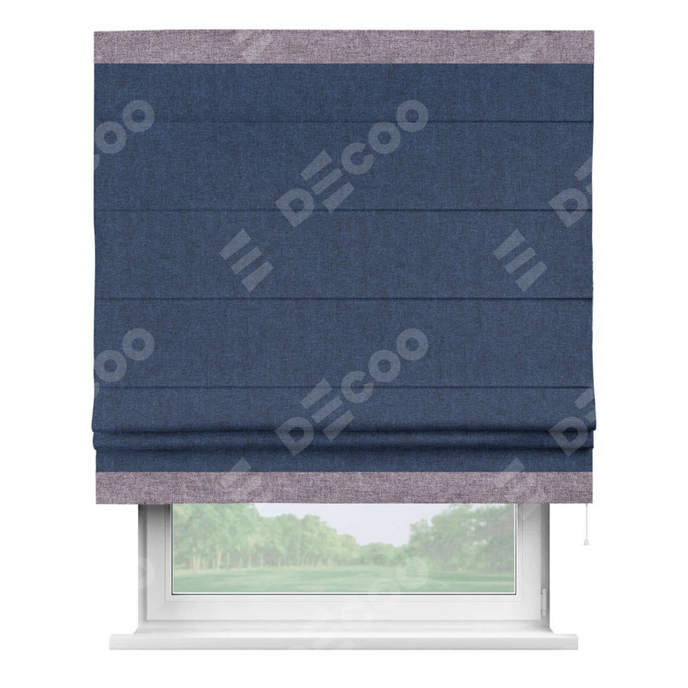 Римская штора пошита из ткани лён кашемир тёмно-синий, артикул: 17215, с отделкой кантом «Горизонт» предлагает уникальное дизайнерское решение, при котором кант располагается только вверху и снизу шторы. Такое решение делает акцент на горизонтальных линиях, визуально расширяя пространство и придавая окну более строгий и организованный вид. Отделка кантом в этих ключевых местах не только украшает штору, но и способствует её долговечности, защищая наиболее уязвимые к износу края.