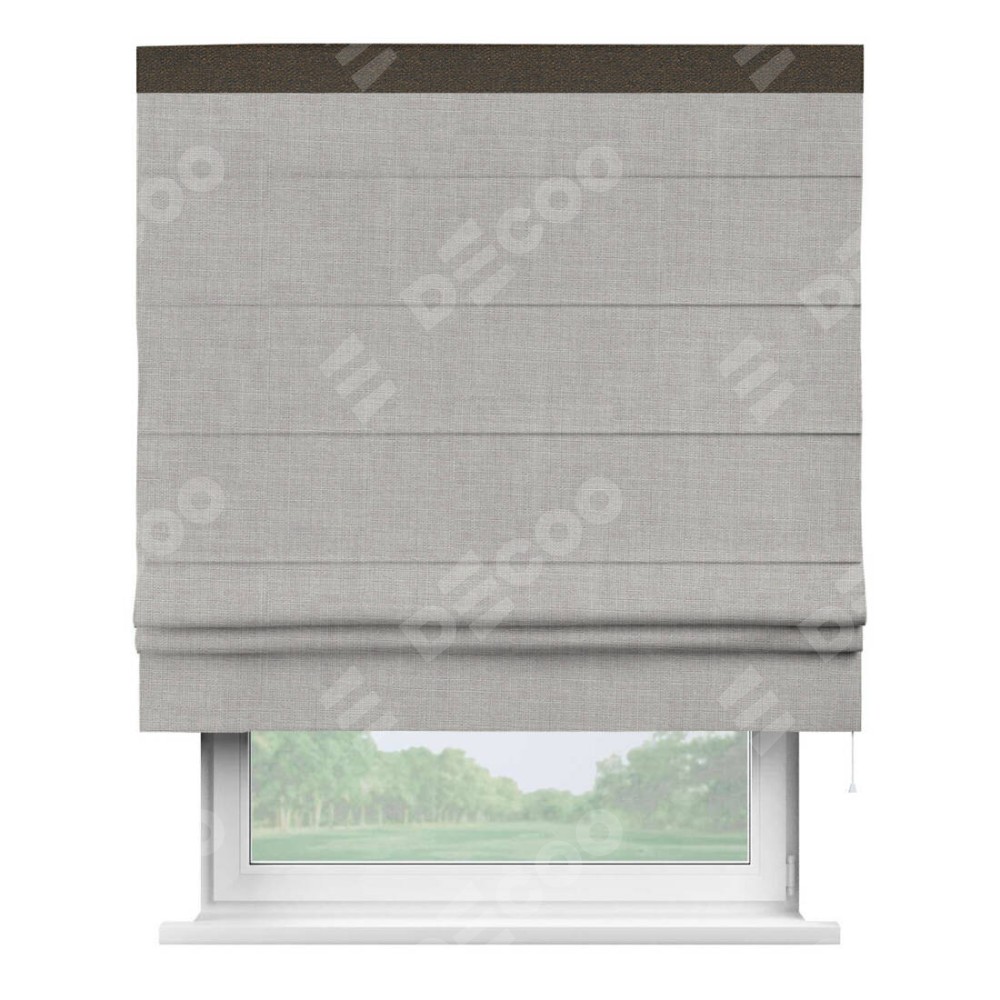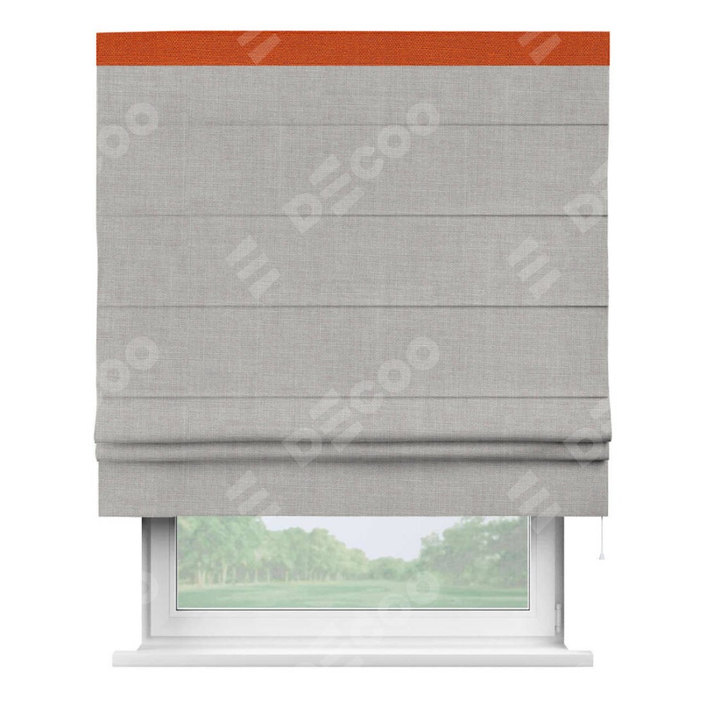Римская штора пошита из ткани лён серый, артикул: 91410, с отделкой кантом «Кинг» отличается своей необычной особенностью: кант располагается исключительно сверху шторы. Такой дизайн делает акцент на верхней части окна, визуально поднимая потолок и придавая интерьеру более возвышенный и изысканный вид. Отделка кантом на верхней кромке не только украшает штору, но и может служить дополнительной защитой от износа в месте наибольшего контакта с механизмом управления шторой.