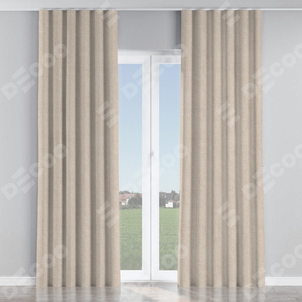 Комплект прямых штор, от производителя «Cortin», пошиты из ткани лён кашемир натуральный беж. С изнаночной стороны в верхней части штор пристрачивается шторная лента с декоративными складками «Волна». Для создания элегантных складок рекомендуемый коэффициент 1:2 (на 100 см. ширины проёма 200 см. ширины ткани). Важно! Ширина штор указана без учёта коэффициента сборки!