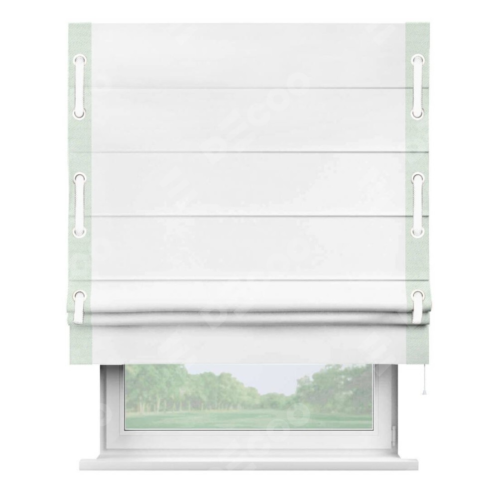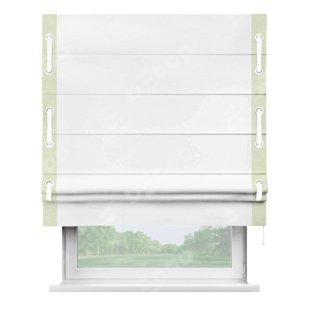 Римская штора «Кортин» для проёма, вайтаут однотонная белая с кантом Стрим Дуо (люверсы с пояском)