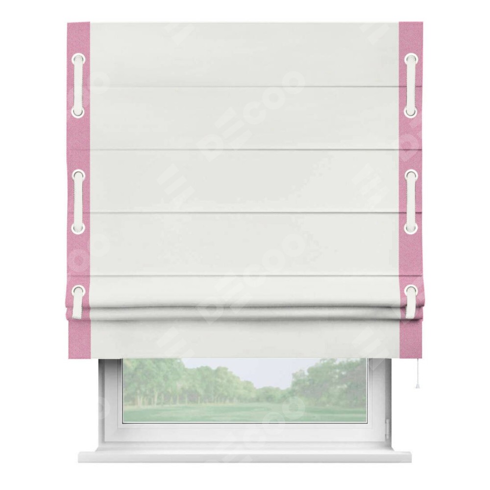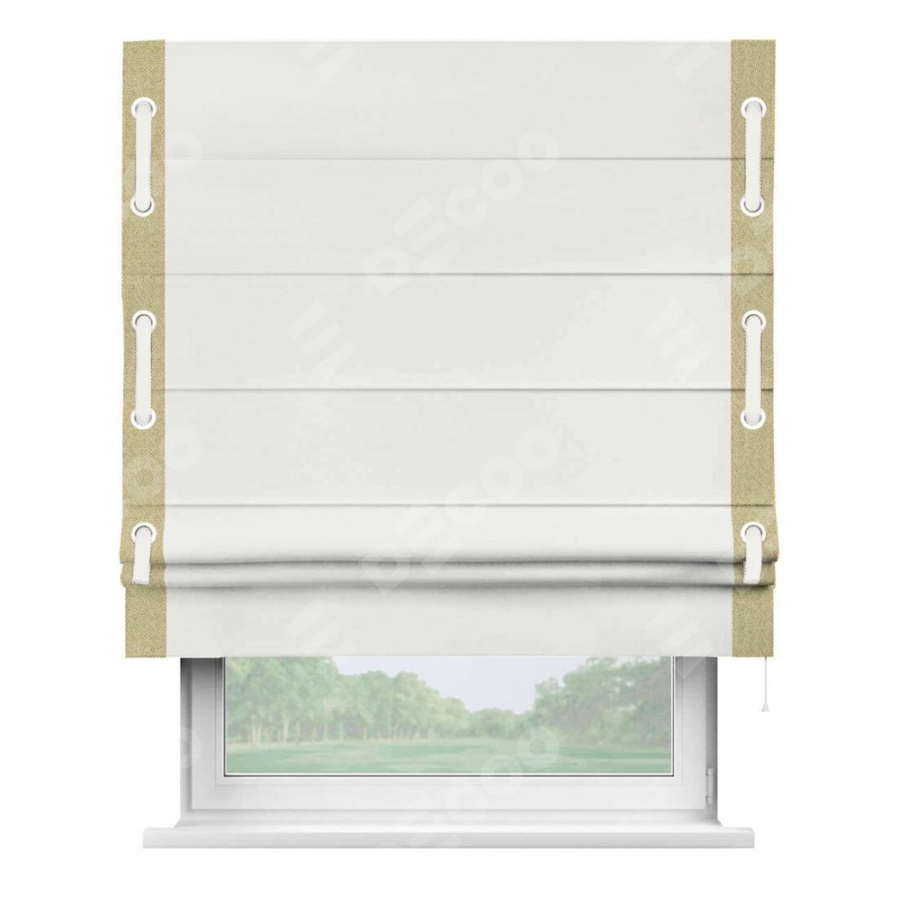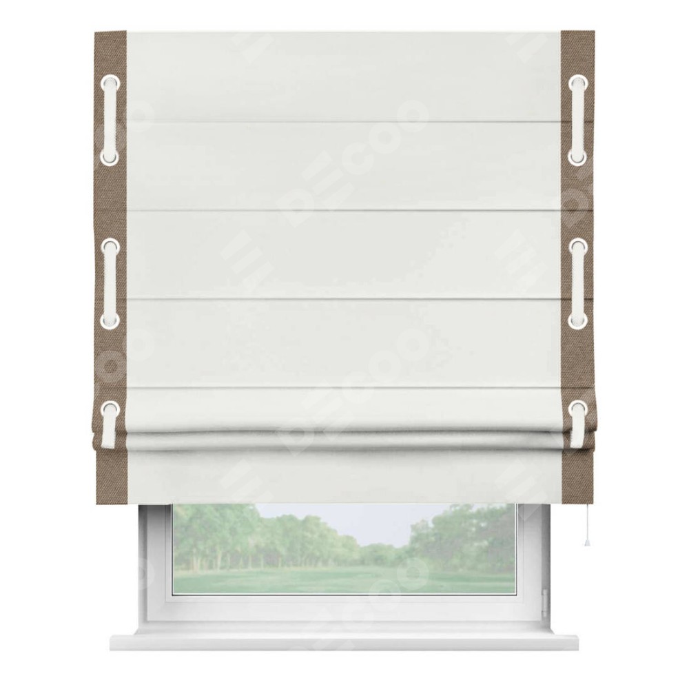 Римская штора «Кортин» для проема, лён димаут молочный с кантом Стрим Дуо (люверсы с пояском)