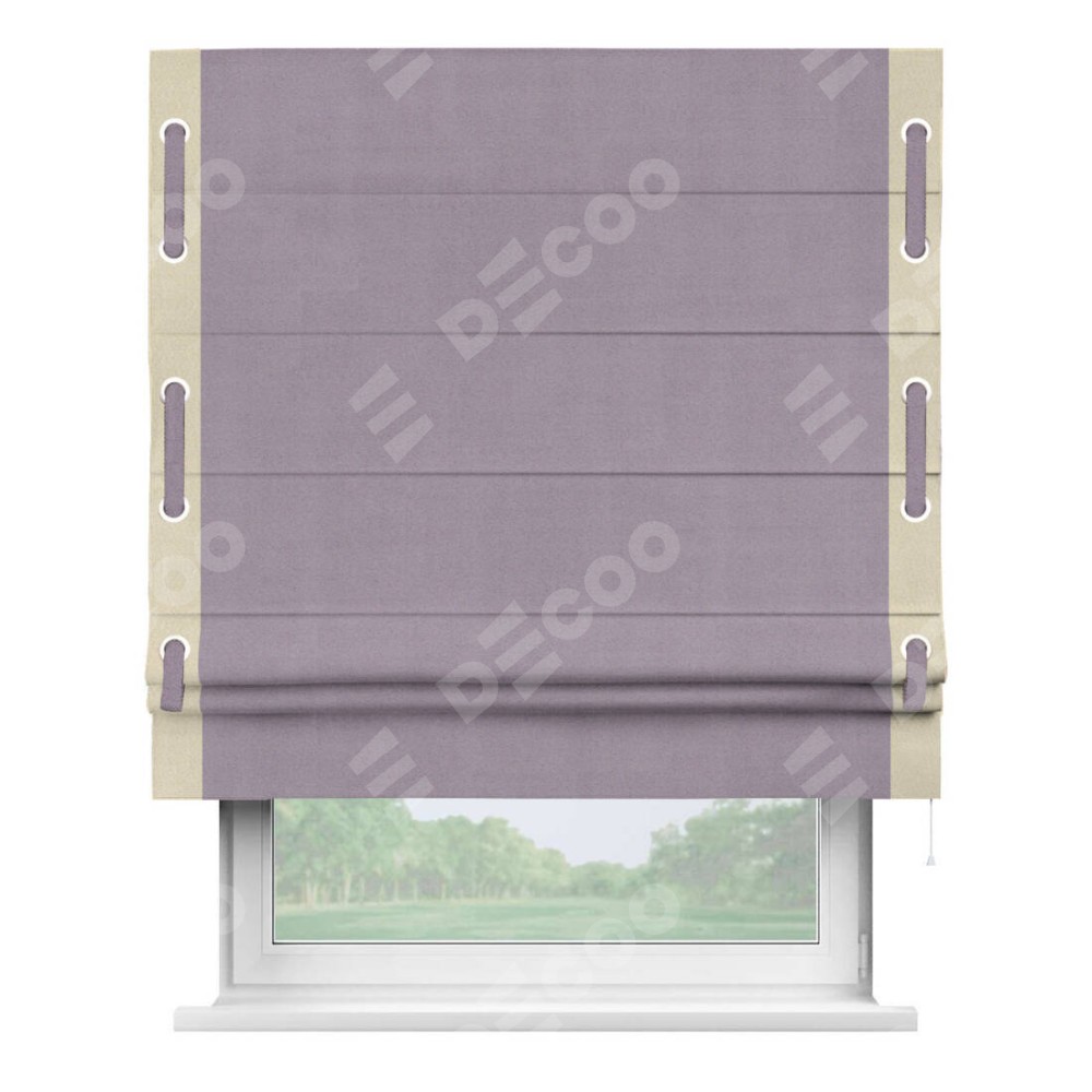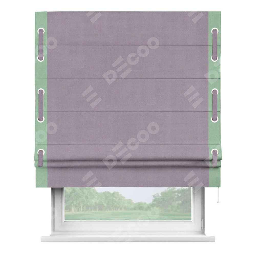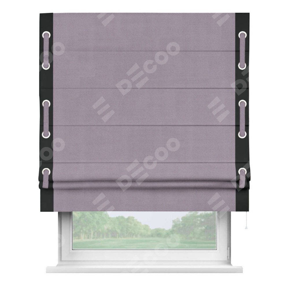 Римская штора «Кортин» для проёма, блэкаут однотонный лиловый с кантом Стрим Дуо (люверсы с пояском)