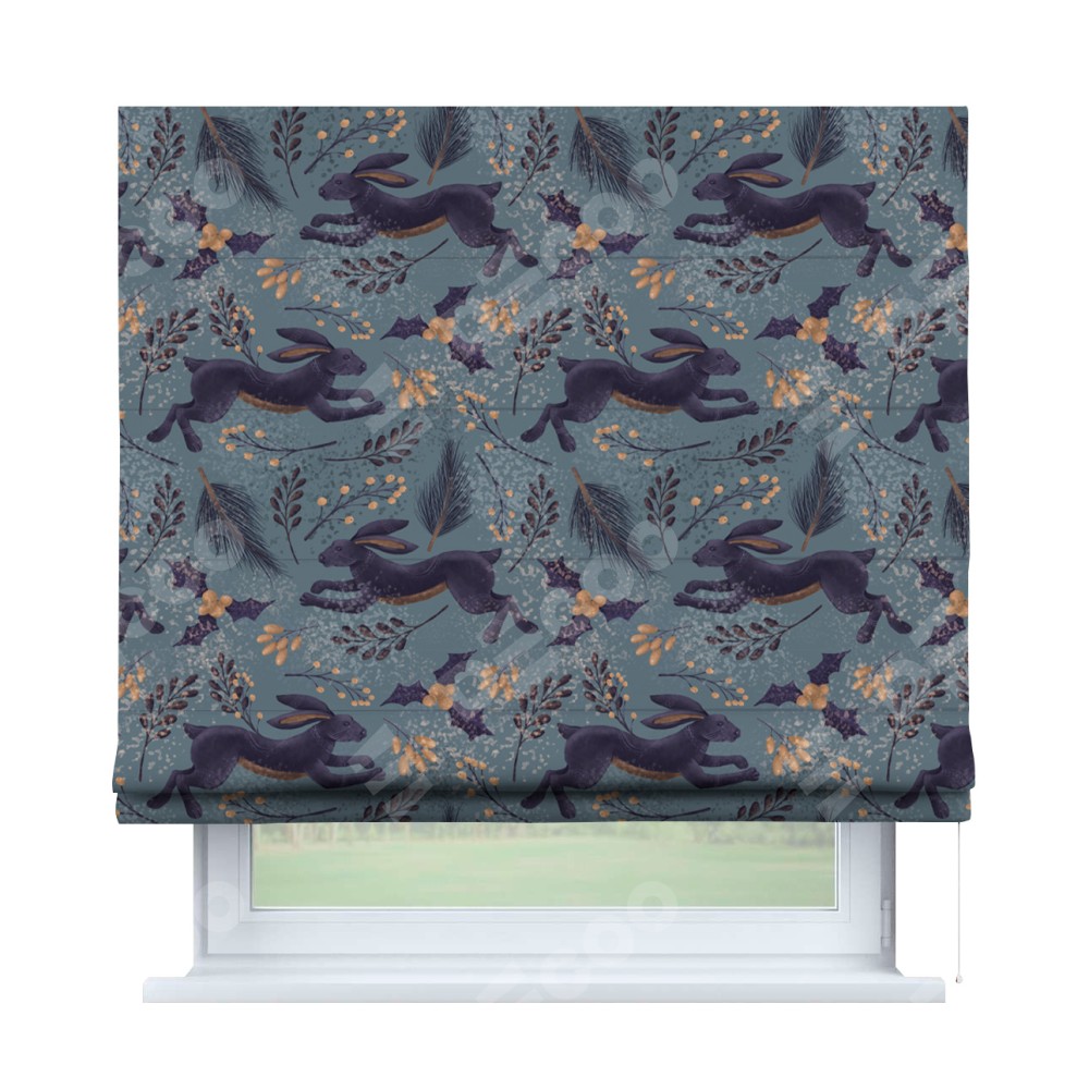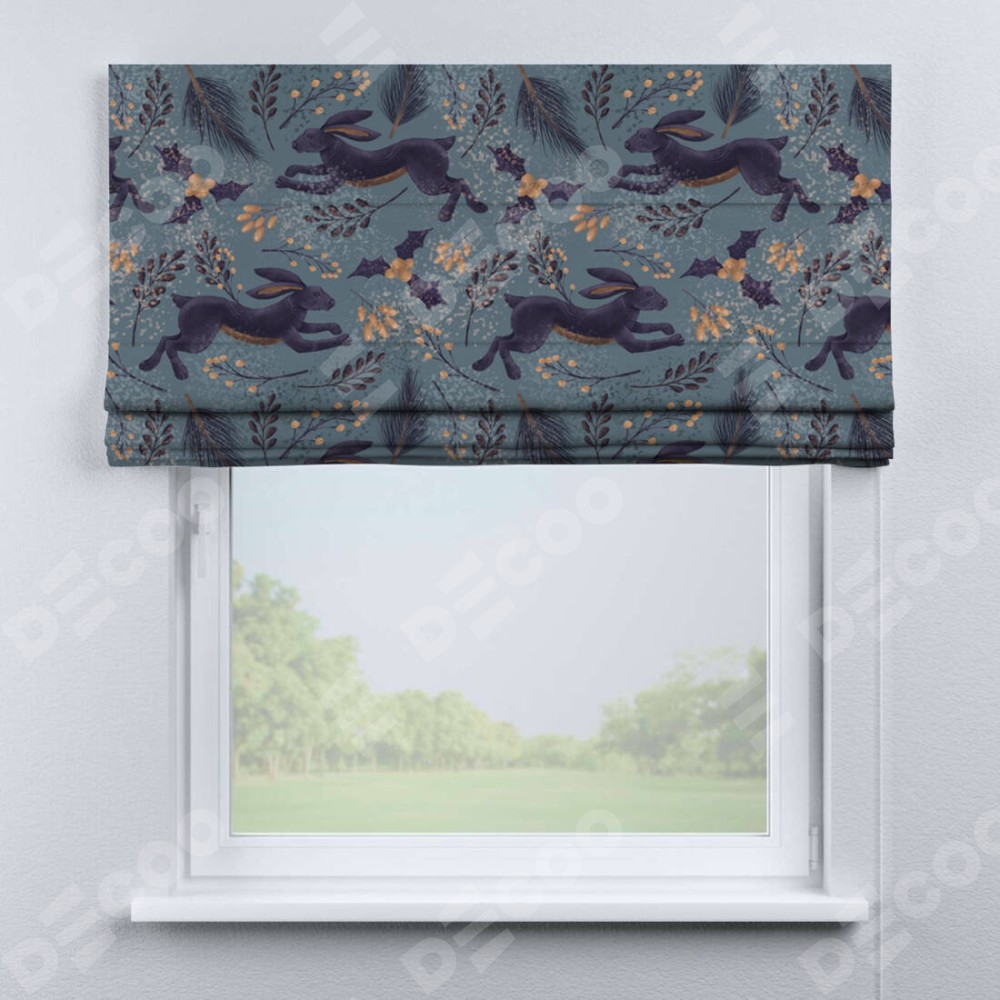 Классическая римская штора производителя «Cortin», пошита из ткани дарк арт зайцы, артикул:. Имеет универсальный механизм и подходит для монтажа: на потолок, на стену и в нишу.
