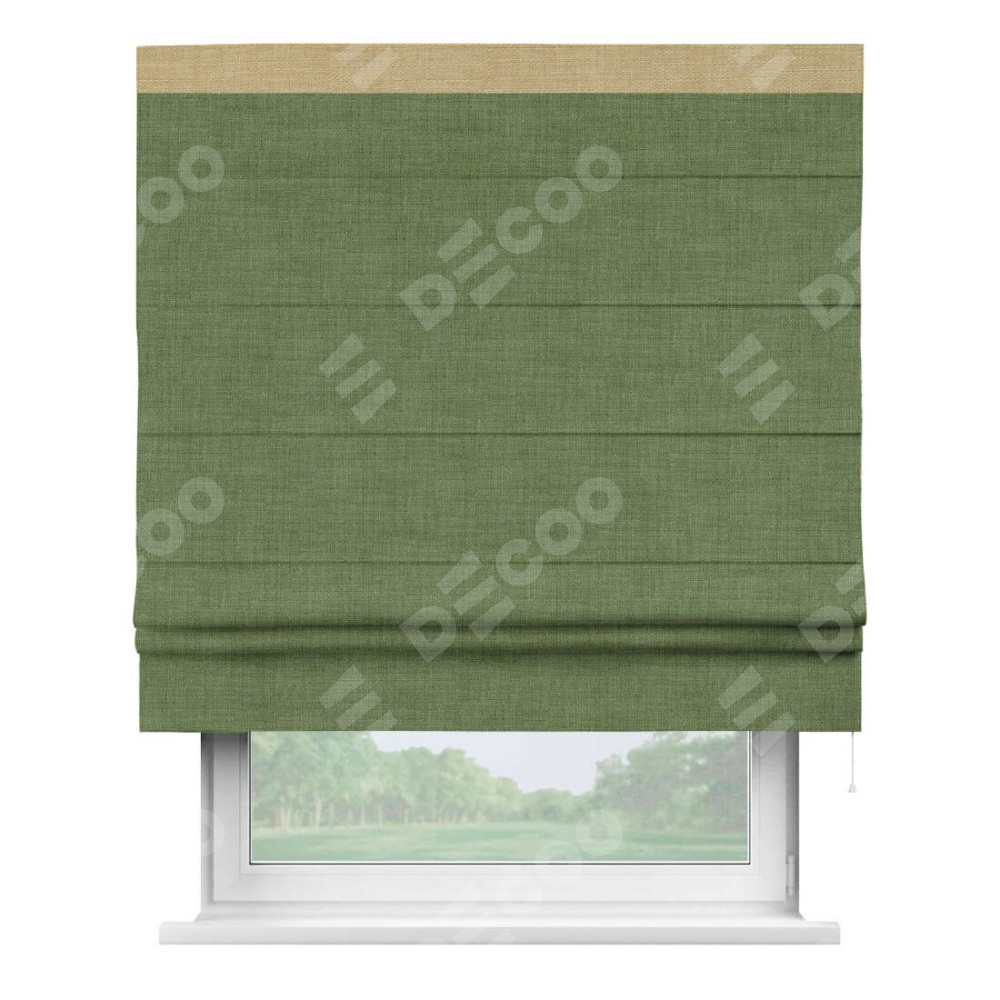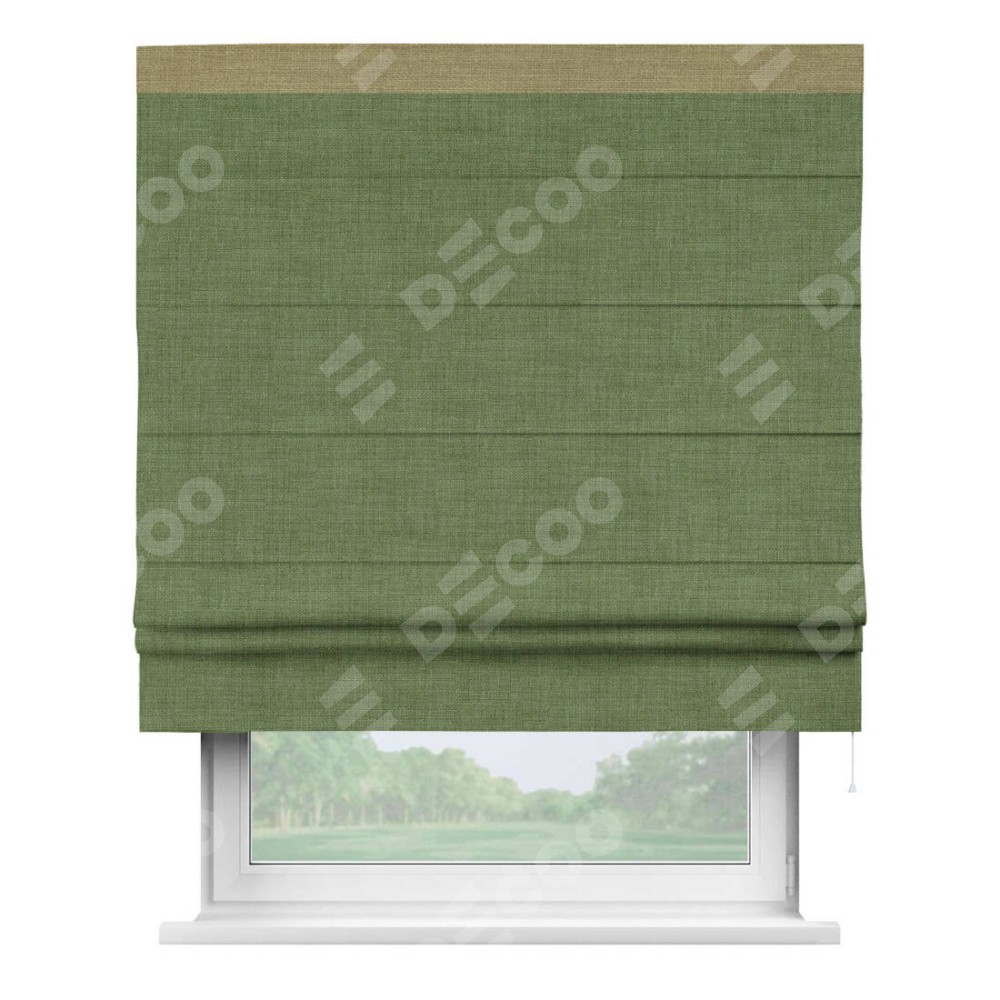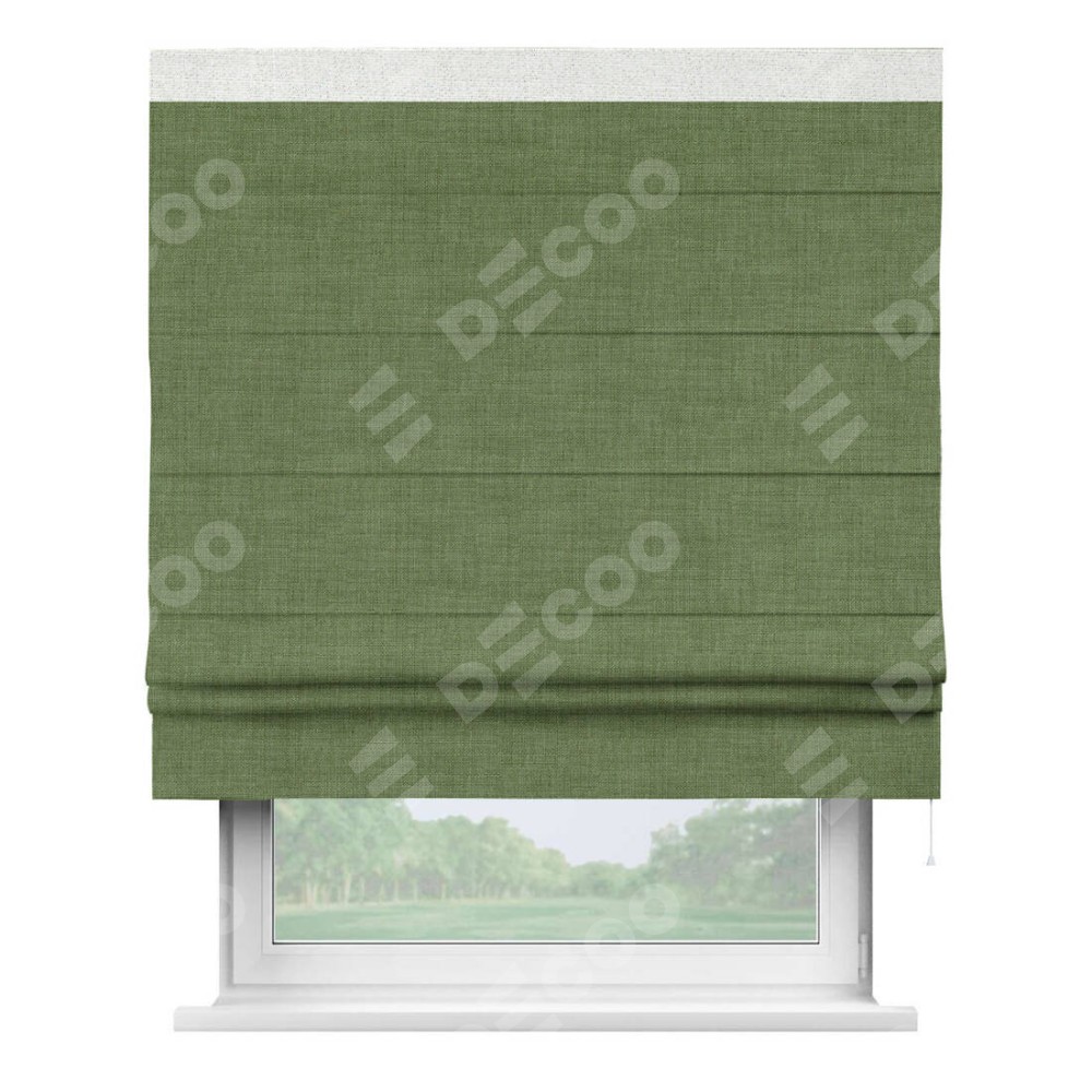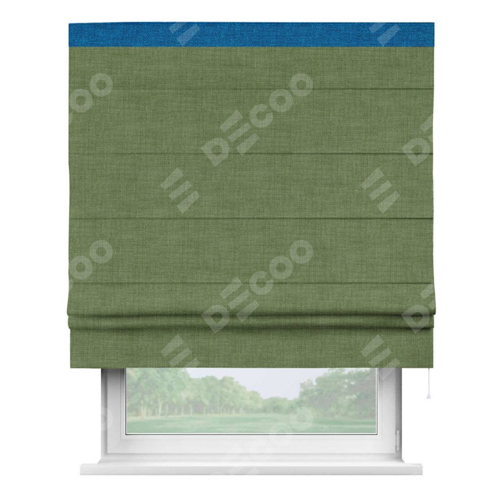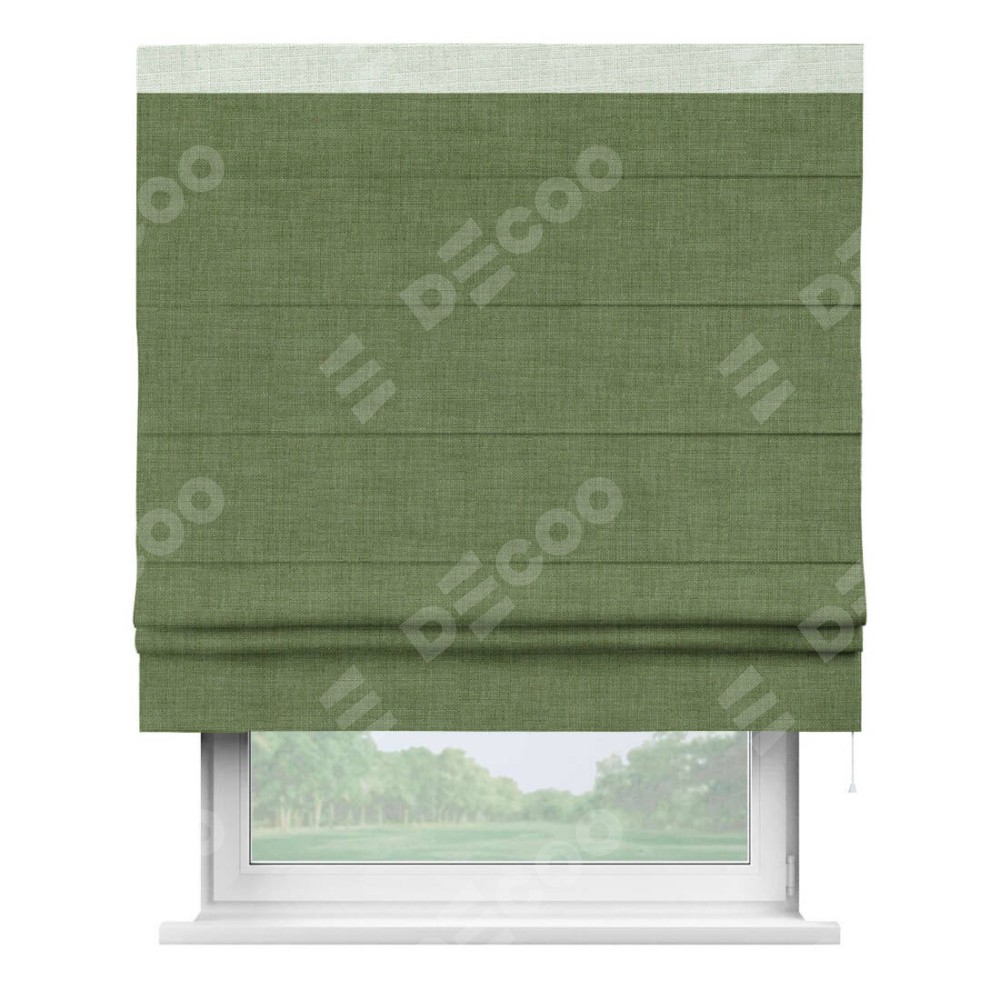 Классическая римская штора производителя «Cortin», пошита из ткани лён зелёный, артикул: 131547. Имеет универсальный механизм и подходит для монтажа: на потолок, на стену и в нишу.