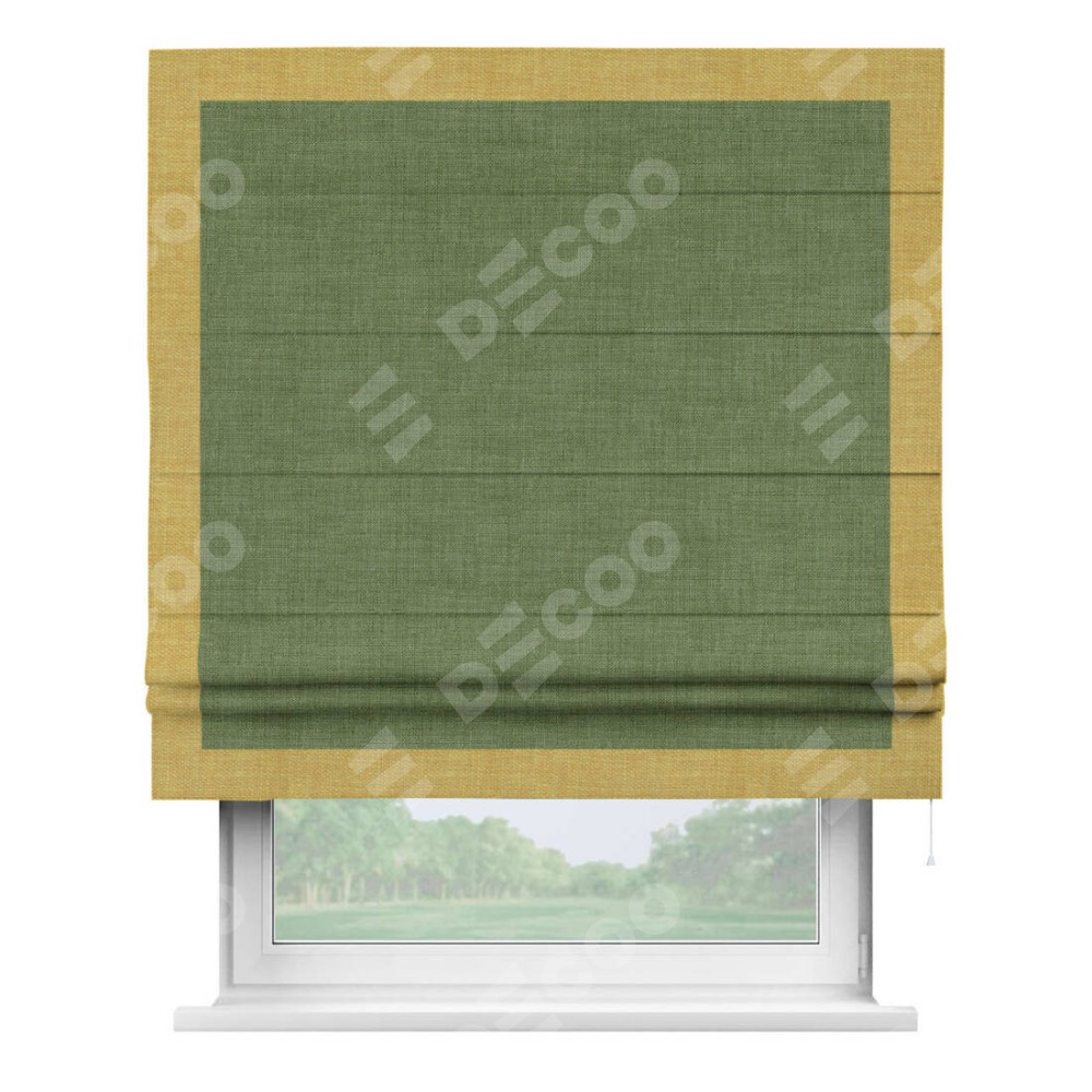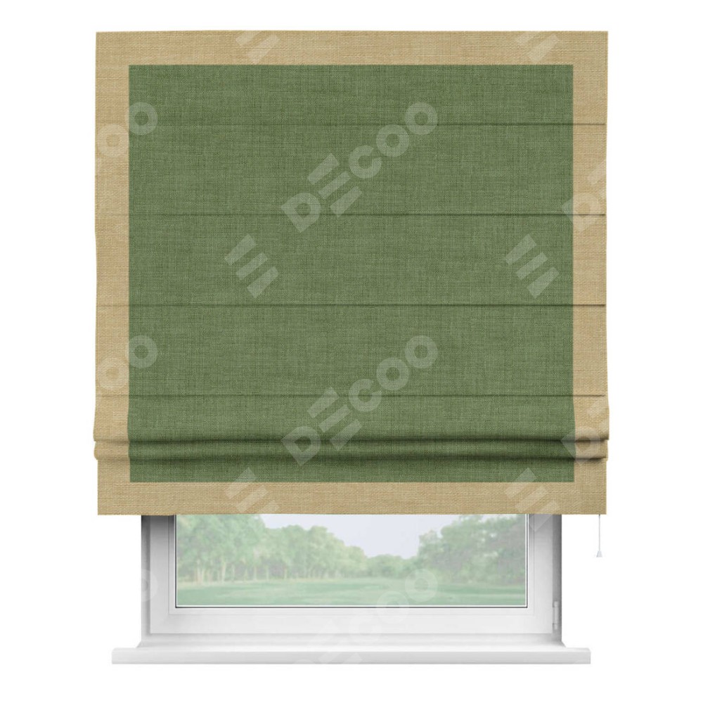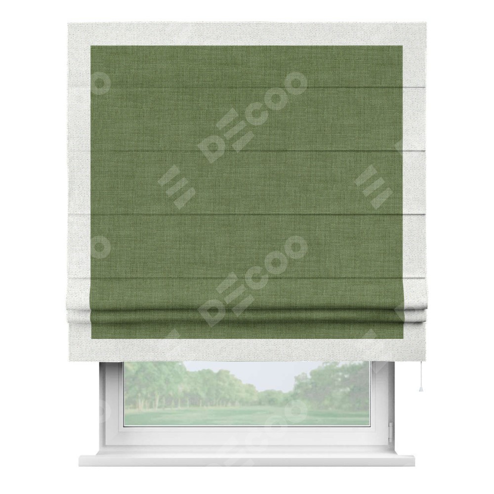 Классическая римская штора производителя «Cortin», пошита из ткани лён зелёный, артикул: 131547. Имеет универсальный механизм и подходит для монтажа: на потолок, на стену и в нишу.