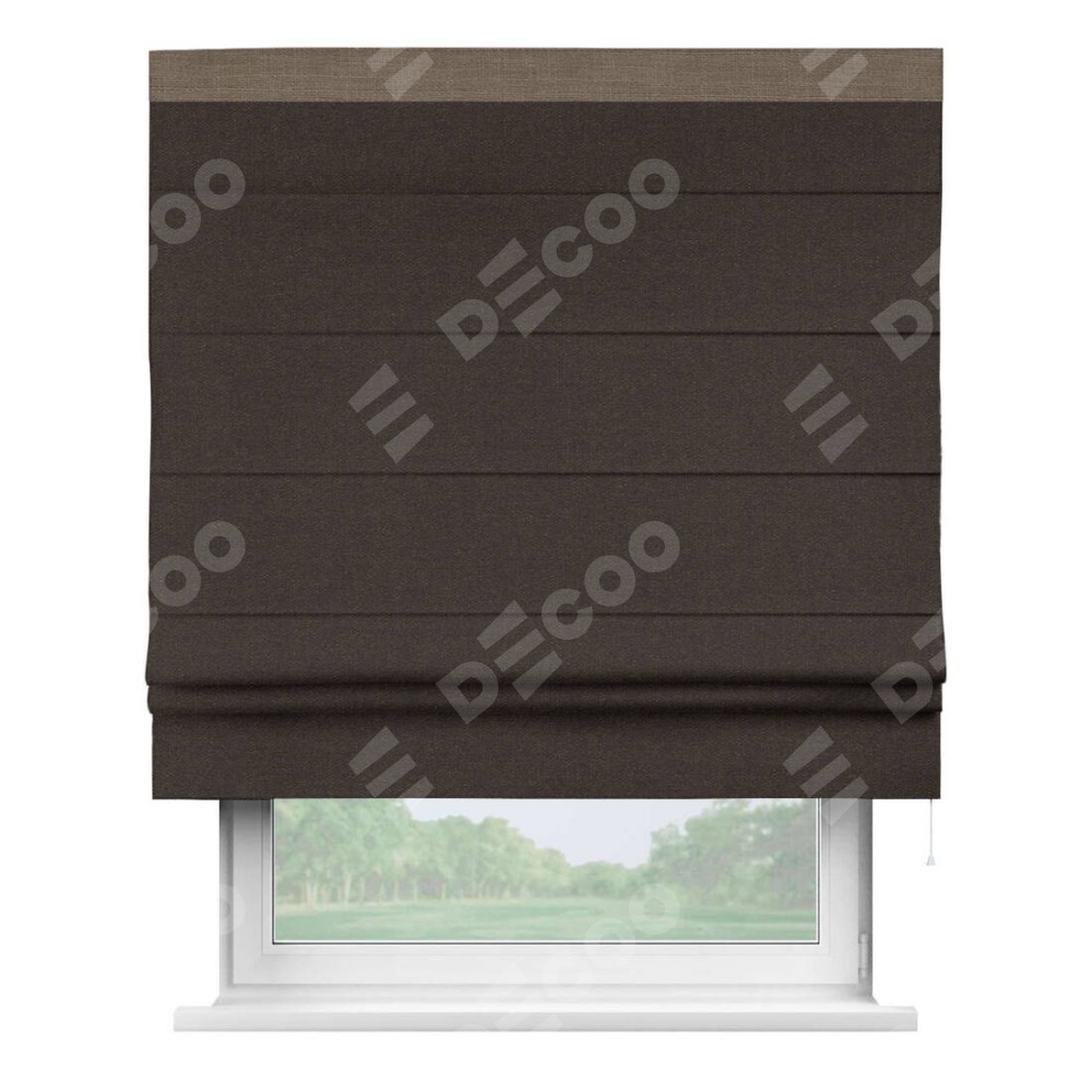 Классическая римская штора производителя «Cortin», пошита из ткани лён тёмно-коричневый, артикул: 104497. Имеет универсальный механизм и подходит для монтажа: на потолок, на стену и в нишу.