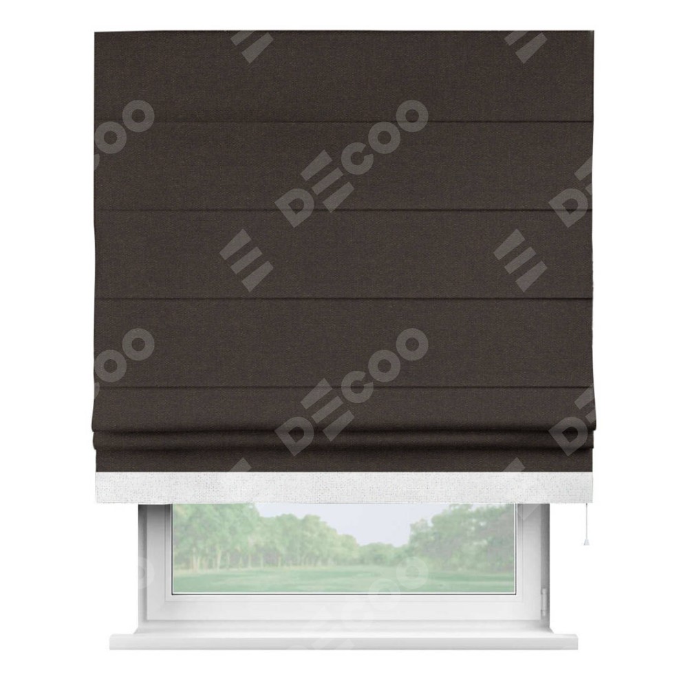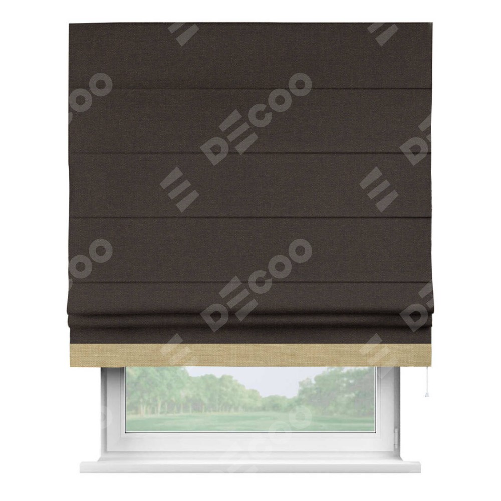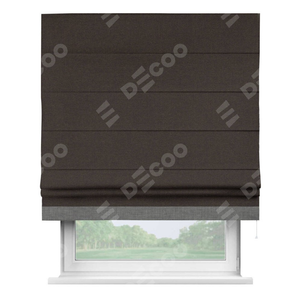Классическая римская штора производителя «Cortin», пошита из ткани лён тёмно-коричневый, артикул: 104497. Имеет универсальный механизм и подходит для монтажа: на потолок, на стену и в нишу.